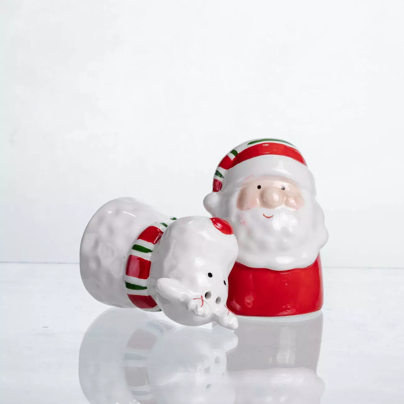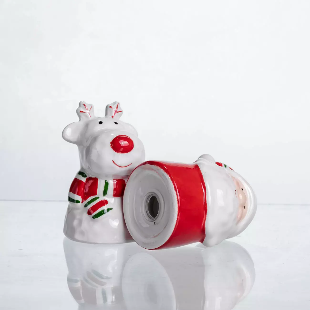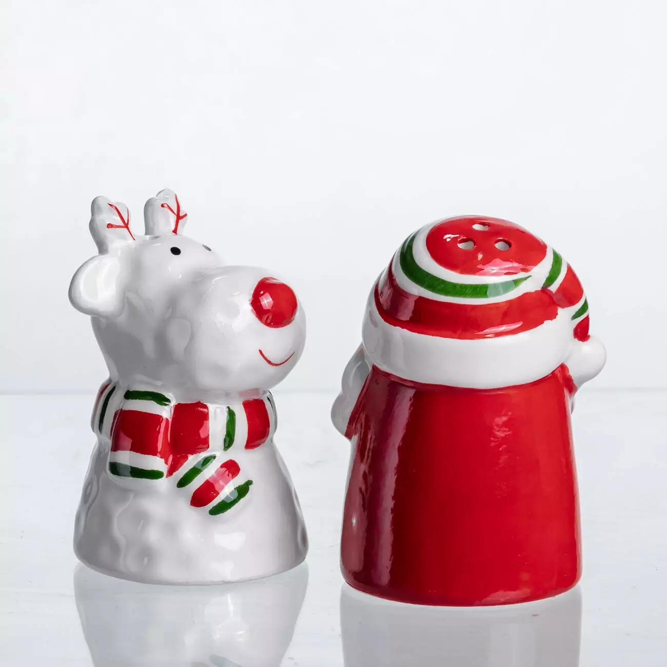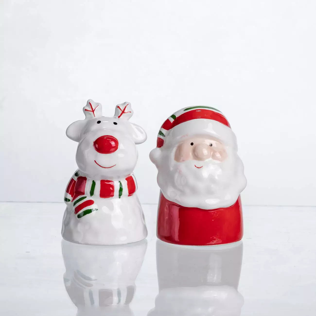 Порцеляновий набір ємностей для спецій "New Year" складається з двох фігурних контейнерів, оформлених у вигляді святкових персонажів — оленя з червоним носом та шарфом, і Санти з характерною шапкою та бородою. Глянцева поверхня, яскраві кольори та тематичний декор створюють виразний акцент на кухні або святковому столі.