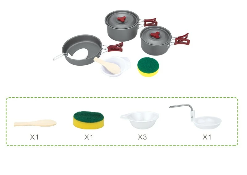 Набір посуду компактних розмірів, призначений для використання в туризмі. Процес приготування їжі на відкритому повітрі буде легким, швидким та приємним. Оптимально для використання невеликою компанією з двох-трьох чоловік. У комплект включені три ємності, ополоник, ложка, губка для миття посуду. Все це дуже зручно для експлуатації в польових умовах. Також передбачений чохол для зберігання і перенесення виробів.
