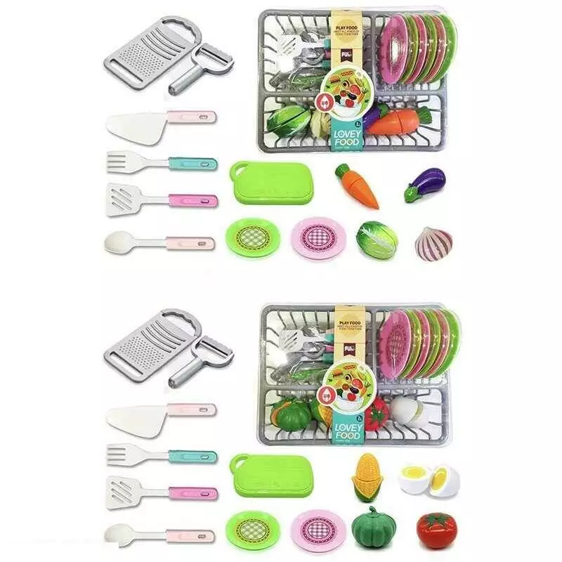 Набір посуду CS 711-11 (80/2) 2 види, продукти на липучках, підставка для посуду, тарілки, столове приладдя, дошка, терка, овочечистка, в слюді