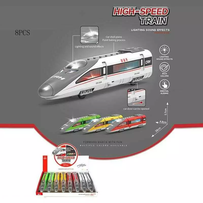 Набір потягів 731-24 C (12) ЦІНА ЗА 8 ШТУК В БЛОЦІ, розмір - 28х4.8х5.7 см, інерція, звуки, підсвічування, дверцята вагона відчиняються, в коробці