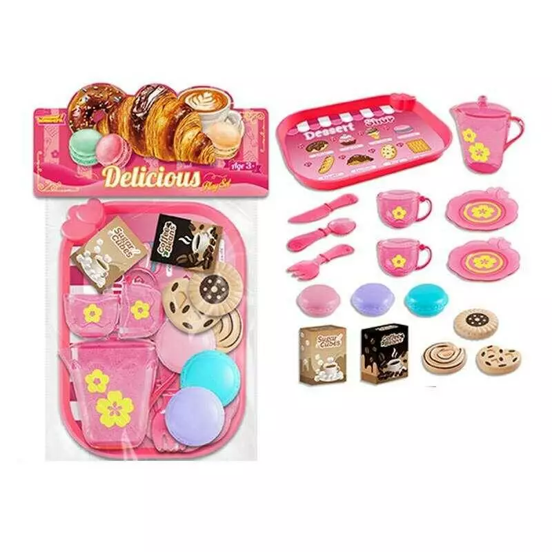 Набір продуктів 99009 (120/2) таця, 2 чашки, 2 блюдця, чайничок, ніж, ложка, вилка, печиво, коробочки з кавою і цукром, в пакеті