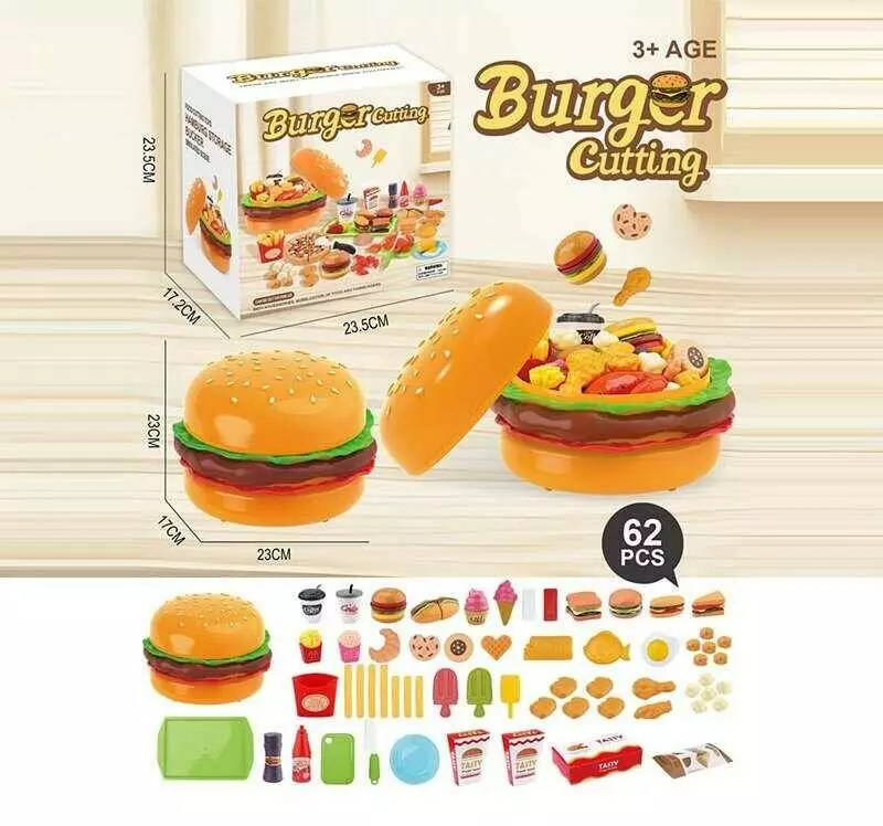 Набір продуктів CB 599 Y9 (30) 62 елементи, великий бургер-бокс, продукти на липучках, посуд, таця, дошка для нарізання, ножичок, в коробці