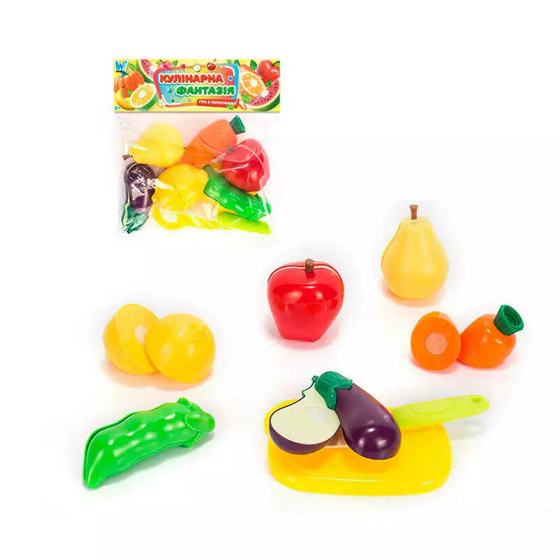 Головна > Каталог > Дитячі товари > Дитячий посуд > Набір продуктів “Кулінарна фантазія” 556622 (144/2) "WToys", 14 елементів, овочі та фрукти на липучках, дошка для нарізання, ніж, у пакеті оптом