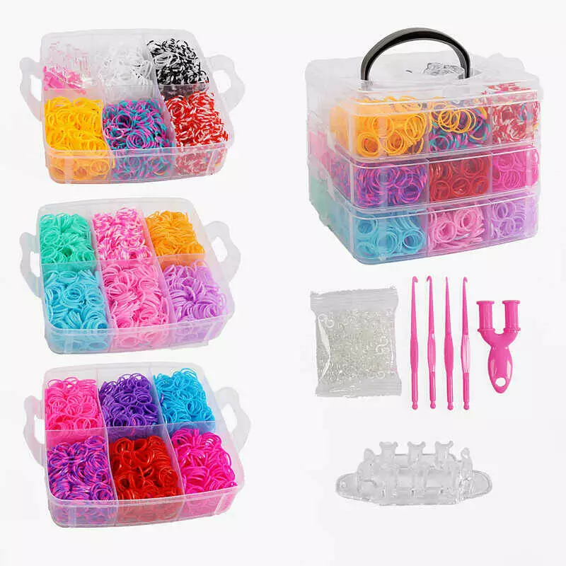 Набір резиночок для плетіння D 117 (60) 17 кольорів, пластикова фурнітура, рогатка, гачки, верстат, інструкція, в боксі