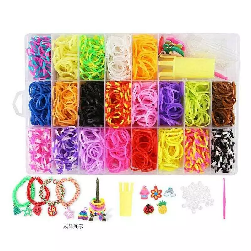 Набір резиночок для плетіння D 892 (80) 21 колір, підвіски, пластикова фурнітура, гачок, мініверстат, інструкція, в боксі