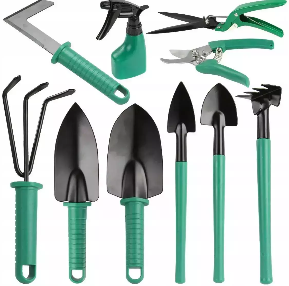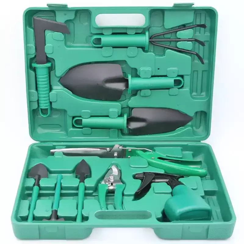 Інструменти виготовлені з міцного металу та зносостійкого пластику, що забезпечує надійність і тривалий термін експлуатації навіть за регулярного використання. Ергономічні ручки зручно лежать у руці та зменшують навантаження під час роботи. До комплекту входять лопатки для саджання рослин, граблі, культиватор-розпушувач, садовий ніж, секатор та інші інструменти, які дають змогу виконувати більшість садових робіт швидко й акуратно.