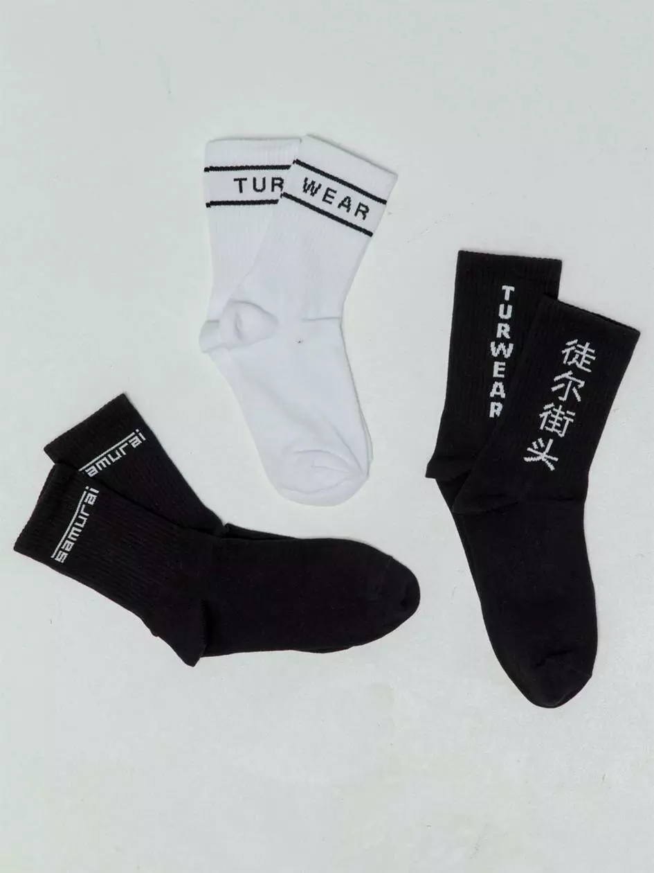 В наборі 3 пари шкарпеток: дві чорного кольору і одна білого (всі з різними принтами).