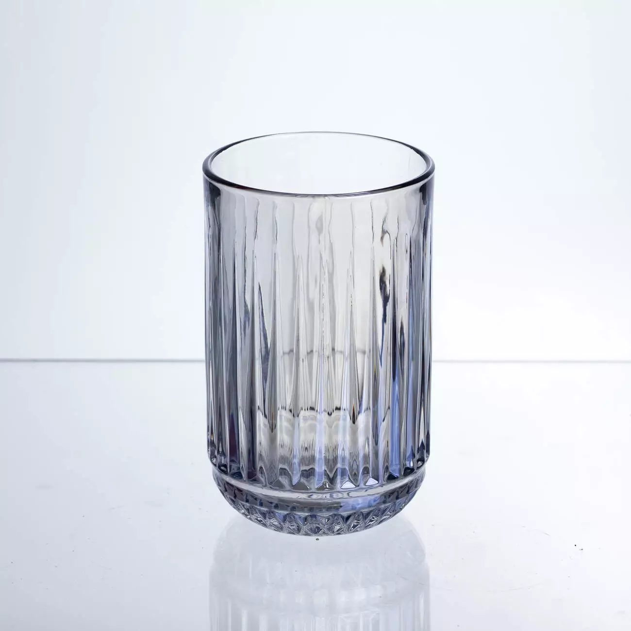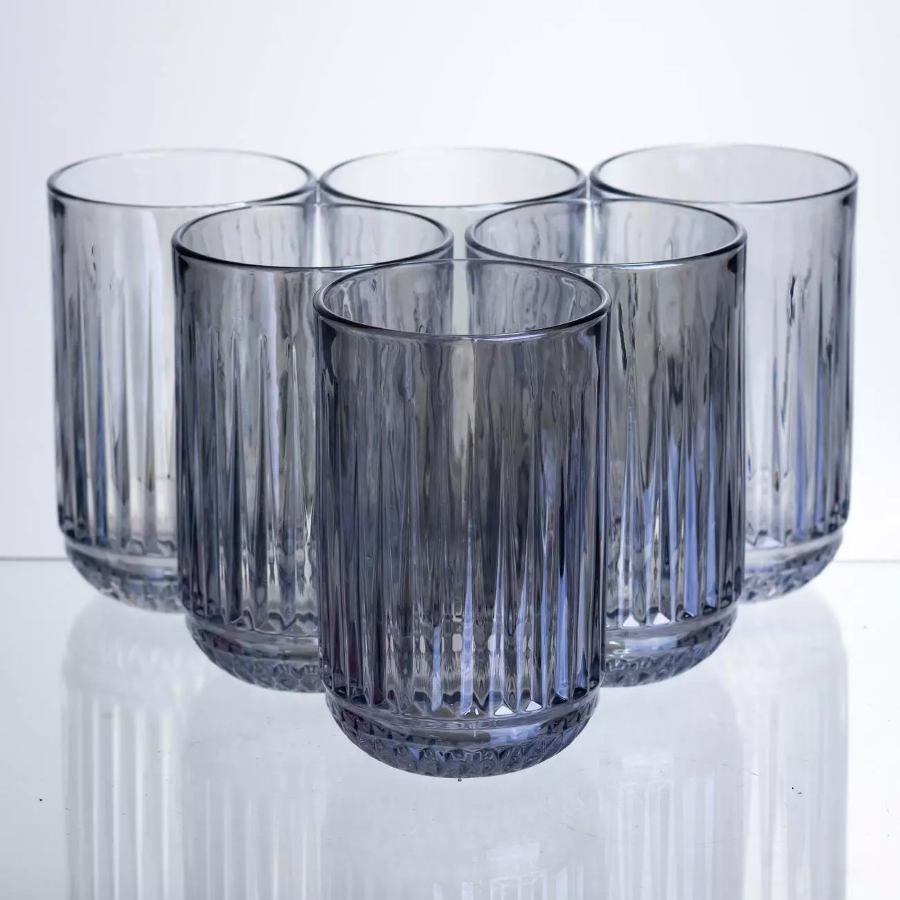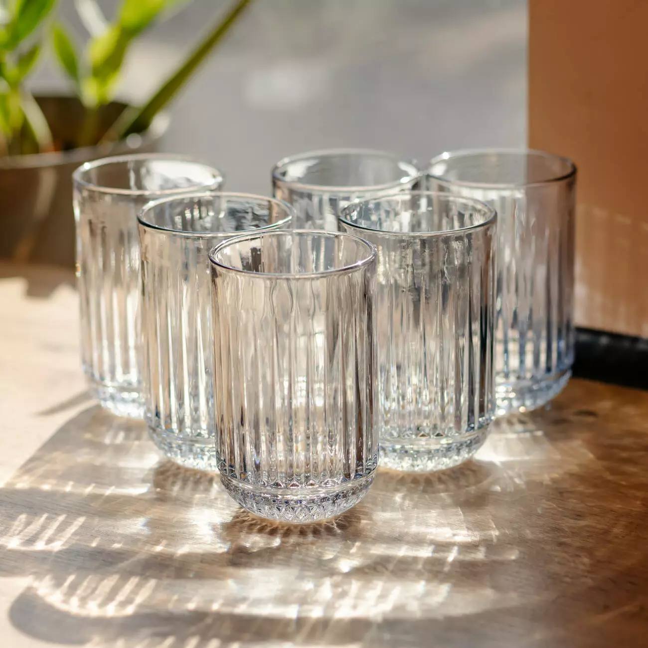 Поверхня склянок прикрашена ребристим візерунком із чітких вертикальних смуг, що створює гру світла, підкреслює прозорість скла та додає об’єму без зайвого декору. Текстурована поверхня також покращує захват і робить вироби виразними.