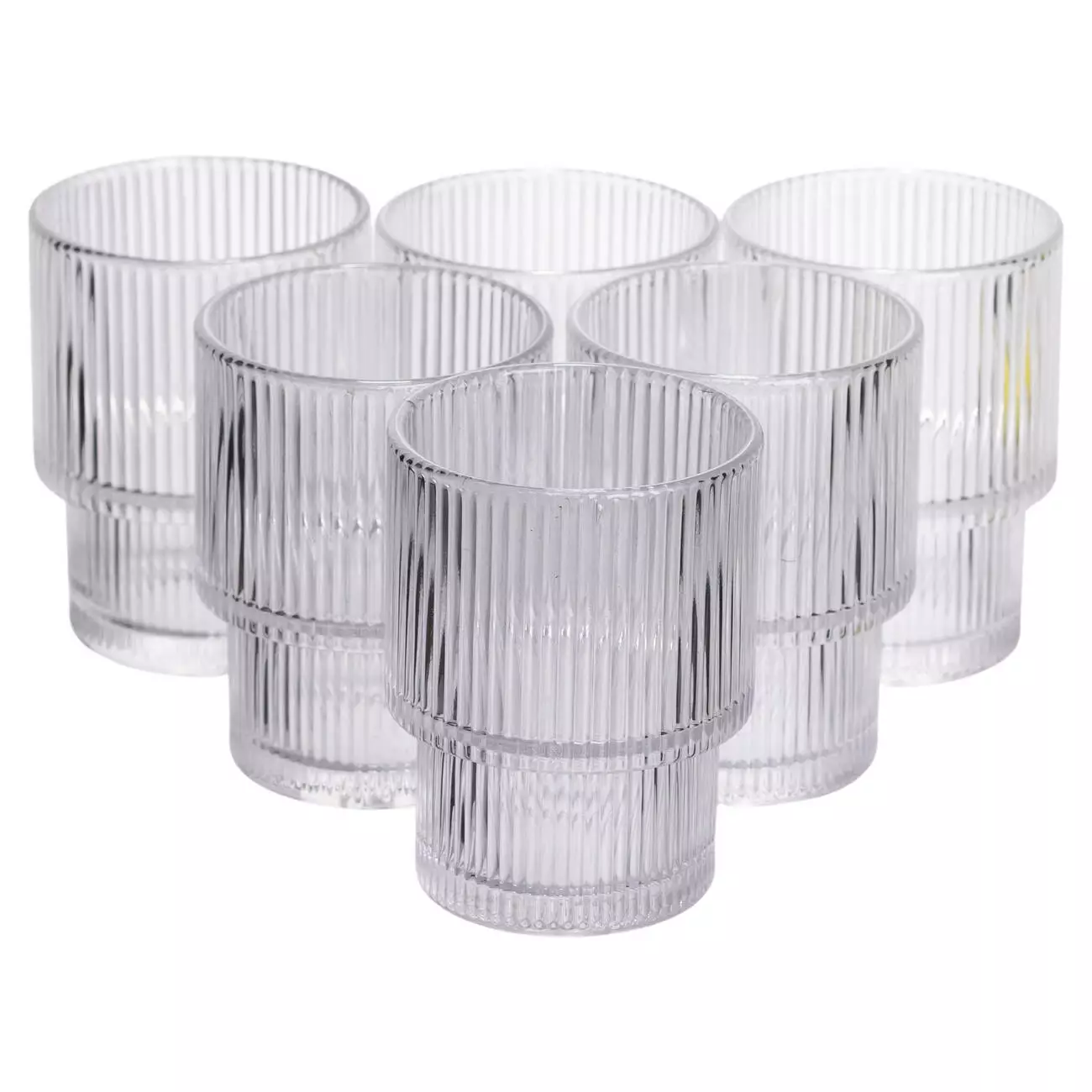 Набір із 6 прозорих склянок об'ємом 200 мл поєднує функціональність та декоративність. Ребриста фактура забезпечує додаткову зручність та створює приємну на дотик поверхню, а товсте скло гарантує довговічність. Ідеальний вибір для щоденного користування та сімейних урочистостей - зручно сервірувати стіл, поєднувати з іншим скляним сервізом або використовувати як подарунок. Склянки мають особливу форму, що дозволяє складати їх один в один, заощаджуючи місце при зберіганні.