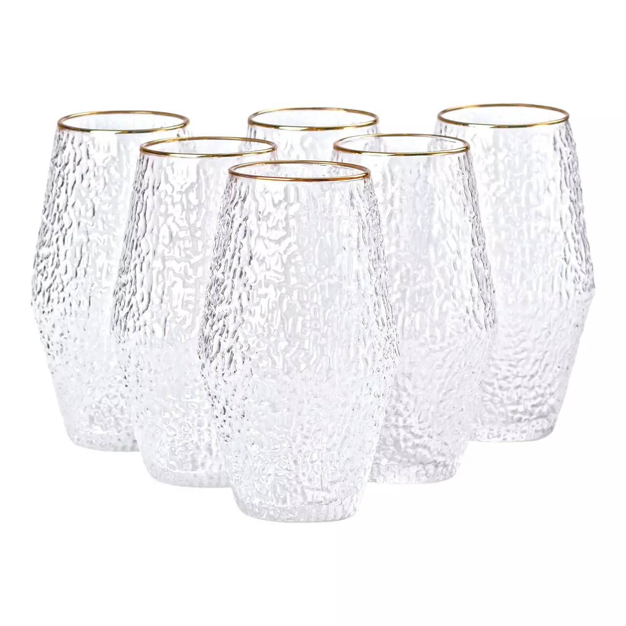Набір склянок Stunning складається з шести фактурних склянок, які поєднують у собі стильний дизайн і практичність. Виготовлені з прозорого скла, ці склянки демонструють елегантність та вишуканість, а їх фактурна поверхня створює цікаву гру світла, додаючи шарму будь-якому напою. Золотий обідок надає склянкам розкішного вигляду, що робить їх чудовим вибором для святкових заходів або особливих моментів.