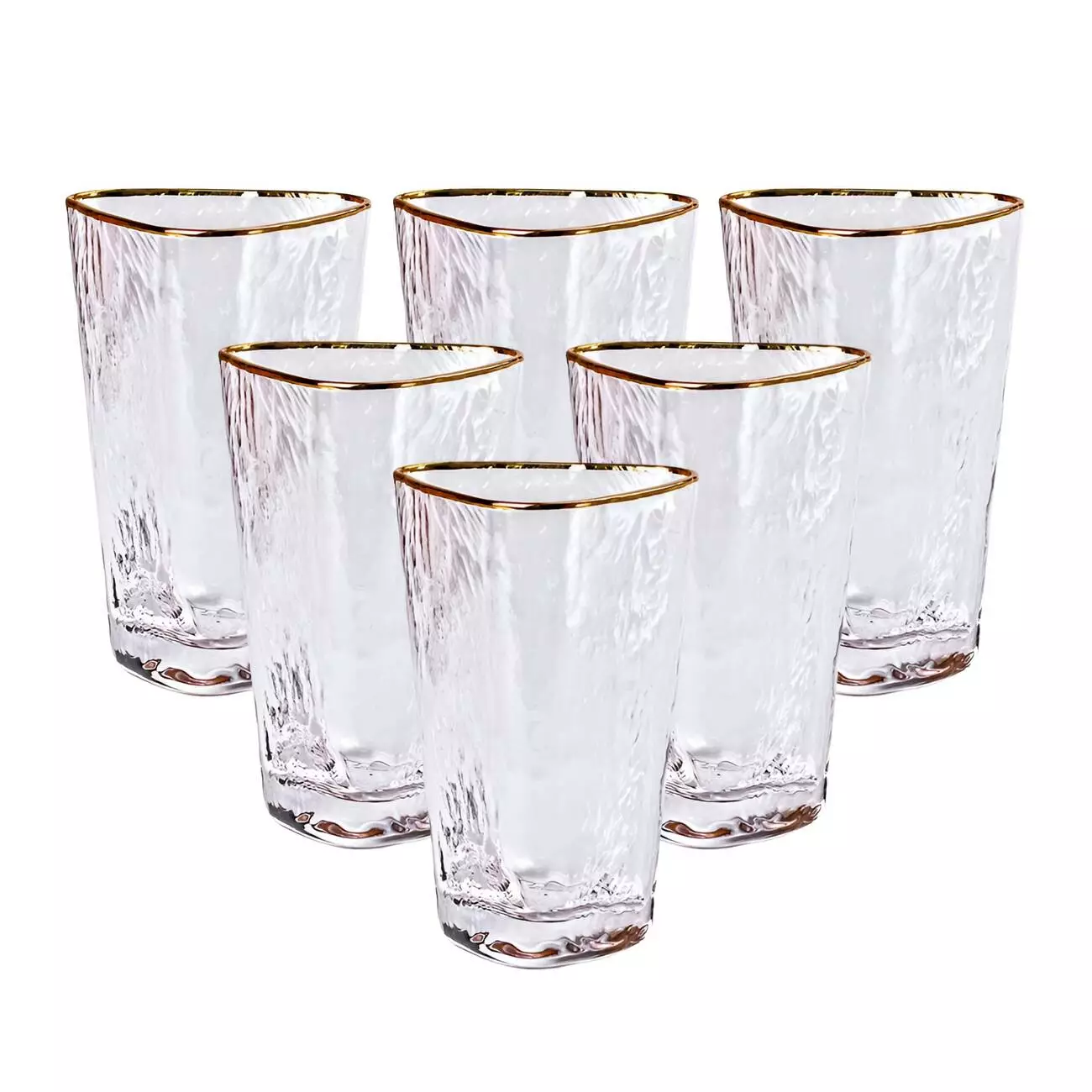 Набір склянок Triangle складається з шести стильних скляних виробів, які вражають своїм мінімалістичним та сучасним дизайном. Склянки виготовлені з прозорого скла, яке дозволяє повністю оцінити колір і текстуру напою, додаючи вишуканості кожній трапезі. Їхня головна особливість — трикутна форма, що додає елементу геометричної гармонії та робить їх візуально цікавими.