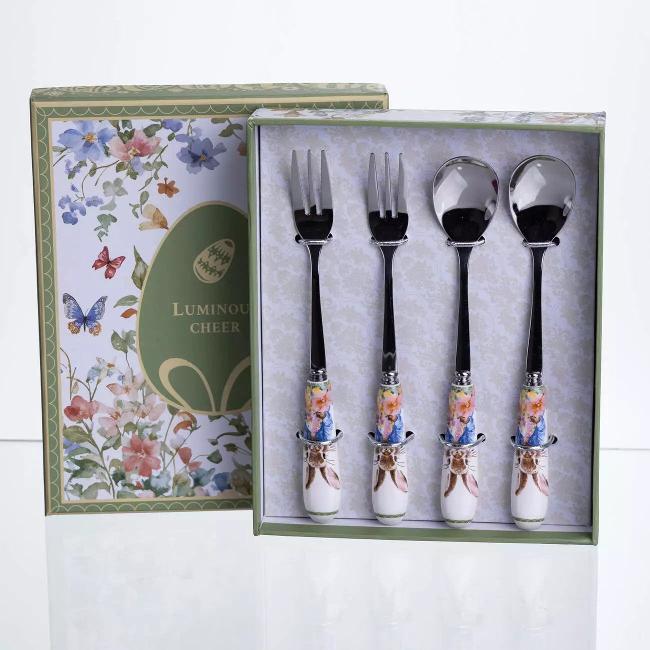 Робоча частина приборів виготовлена з нержавіючої сталі з глянцевим покриттям, що забезпечує акуратний вигляд і зручність використання. Порцелянові ручки продумані для комфортного тримання та декоровані зображеннями кроликів, які гармонійно поєднуються з десертною подачею та тематичним посудом.