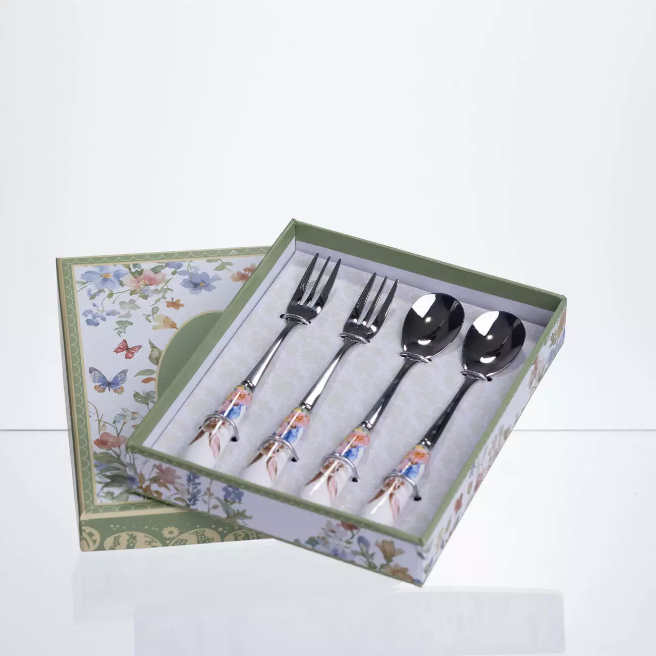 Набір столових приборів Garden Rabbits із 4 предметів призначений для сервірування десертів, тістечок та солодких закусок під час чаювання або святкового столу. Формат із двох десертних ложок та двох десертних вилок дозволяє подавати порційні страви, створюючи цілісне оформлення сервірування без зайвих елементів.