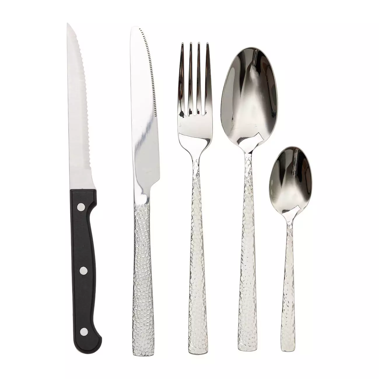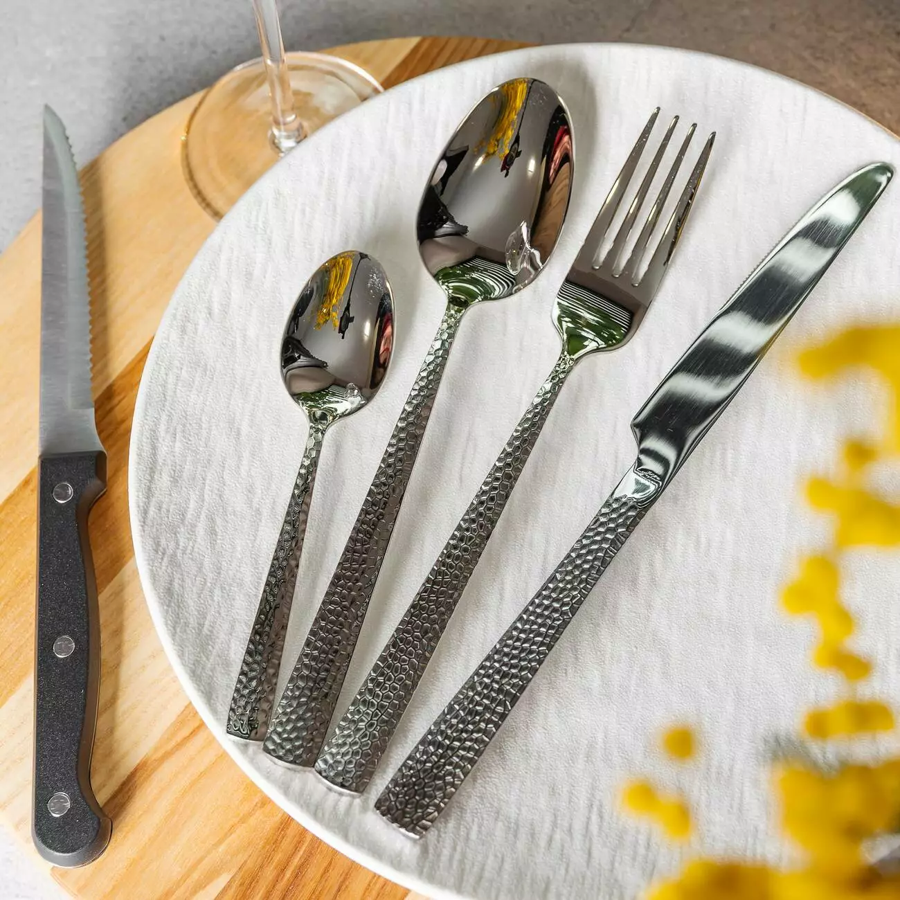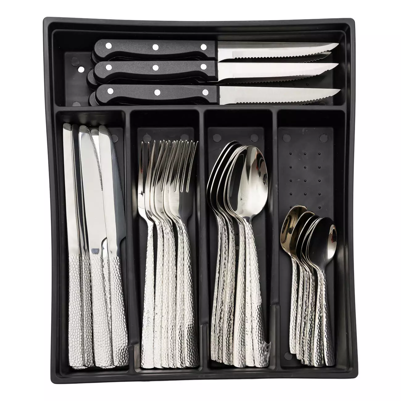 До комплекту входять столові та чайні ложки, виделки, столові ножі та ножі для м’яса. Набір укомплектований підставкою для зручного зберігання й організації приборів. Завдяки оптимальним розмірам вона займає мінімум місця.