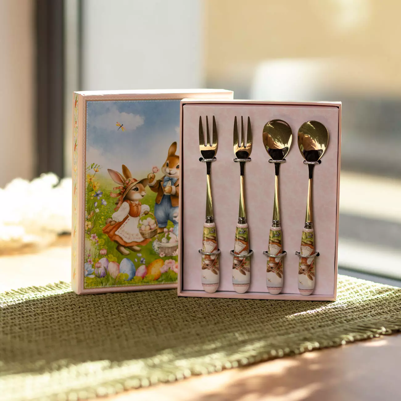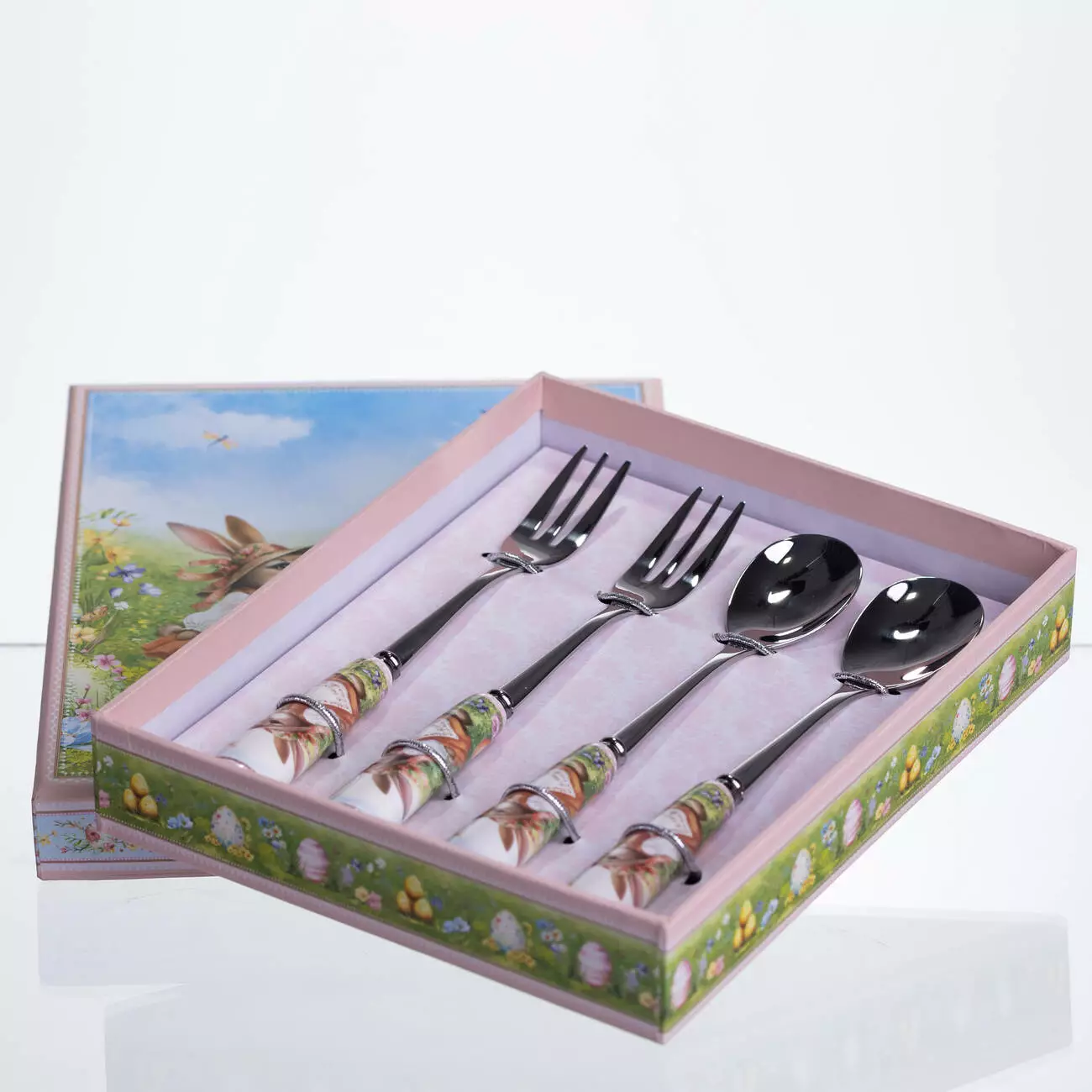 Робоча частина приборів виготовлена з нержавіючої сталі з глянцевим покриттям, що забезпечує акуратний вигляд і зручність використання. Порцелянові ручки продумані для комфортного тримання та декоровані зображеннями кроликів, які гармонійно поєднуються з десертною подачею та тематичним посудом.