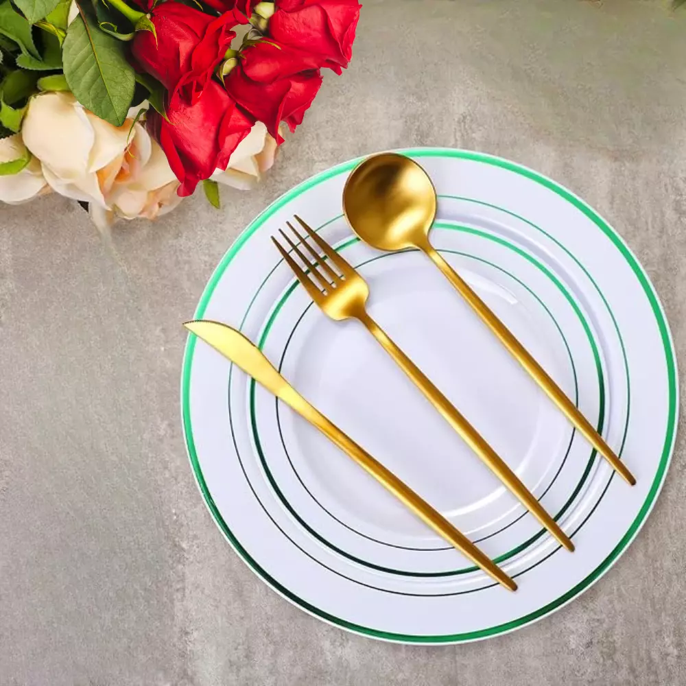білому кольорі з вишуканим зеленим контуром, що надає посуду