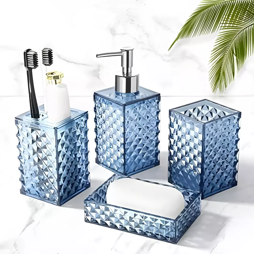 Стильный набор аксессуаров для ванной выполнен из прочного акрила.