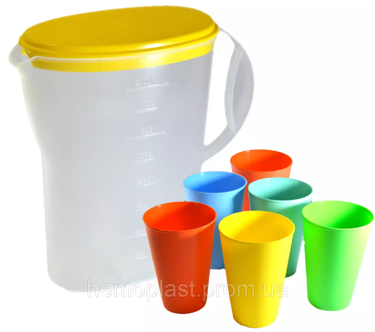 В наборі - глечик об'ємом 2 літри, 6 різнокольорових стаканчиків