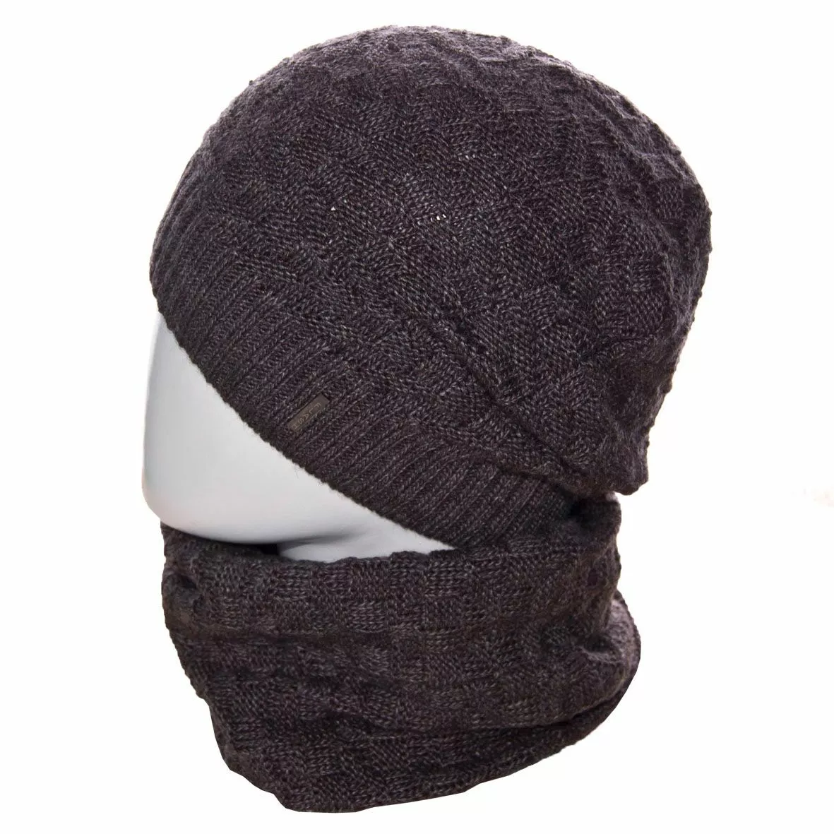 Вязаный однотонный мужской комплект состоит из удлиненной шапки, с