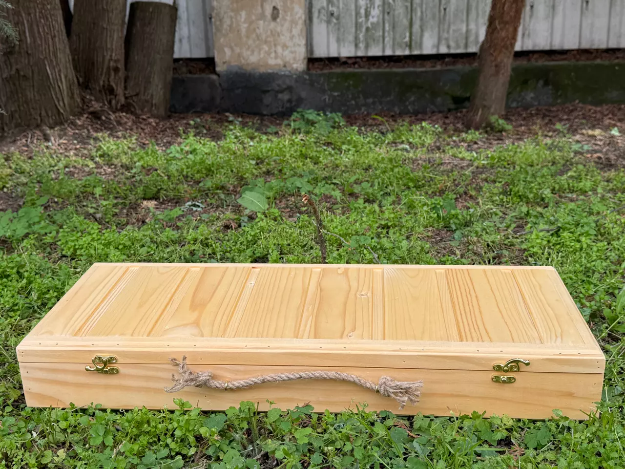 Упаковка: деревянный кейс с ручкой из каната и 2 металлическими