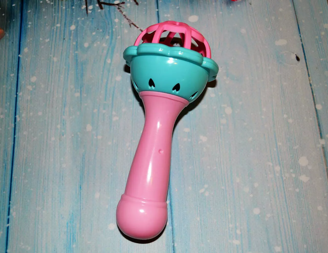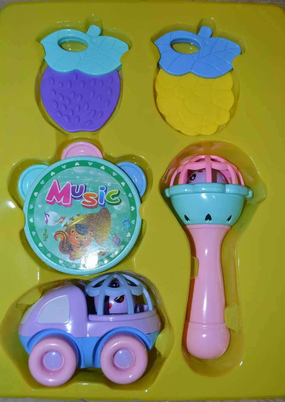 В набор входят 3 погремушки и два грызунка.