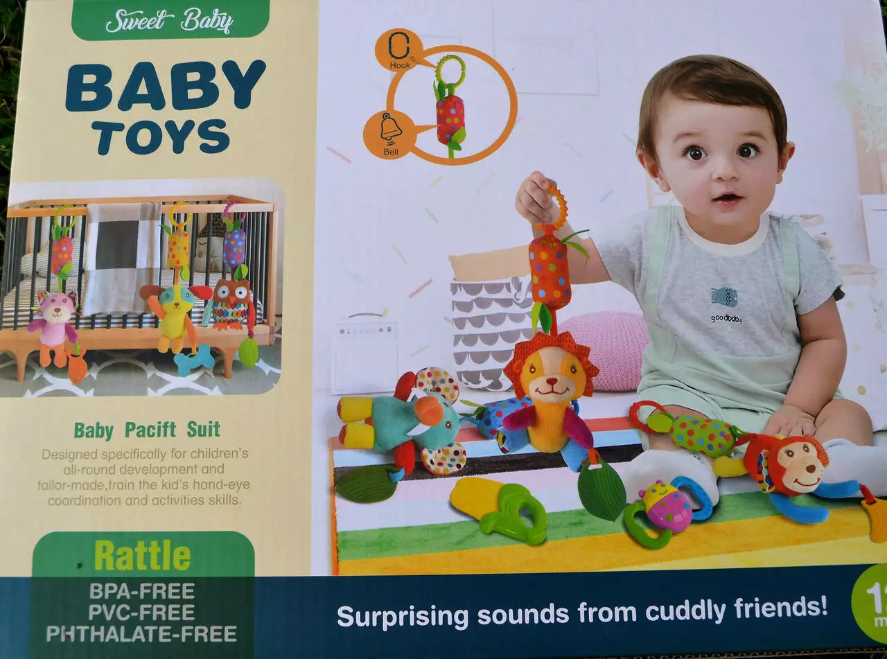 Можно подвешивать к коляске или кроватки за пластиковое кольцо.