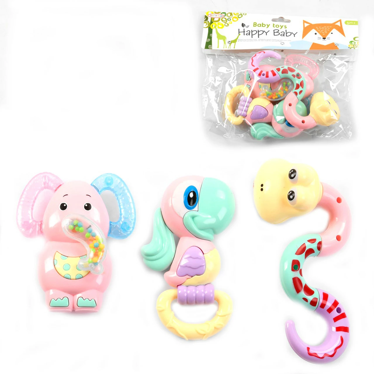 комплектацию включили 3 развивающих игрушки: милый розовый слоник с