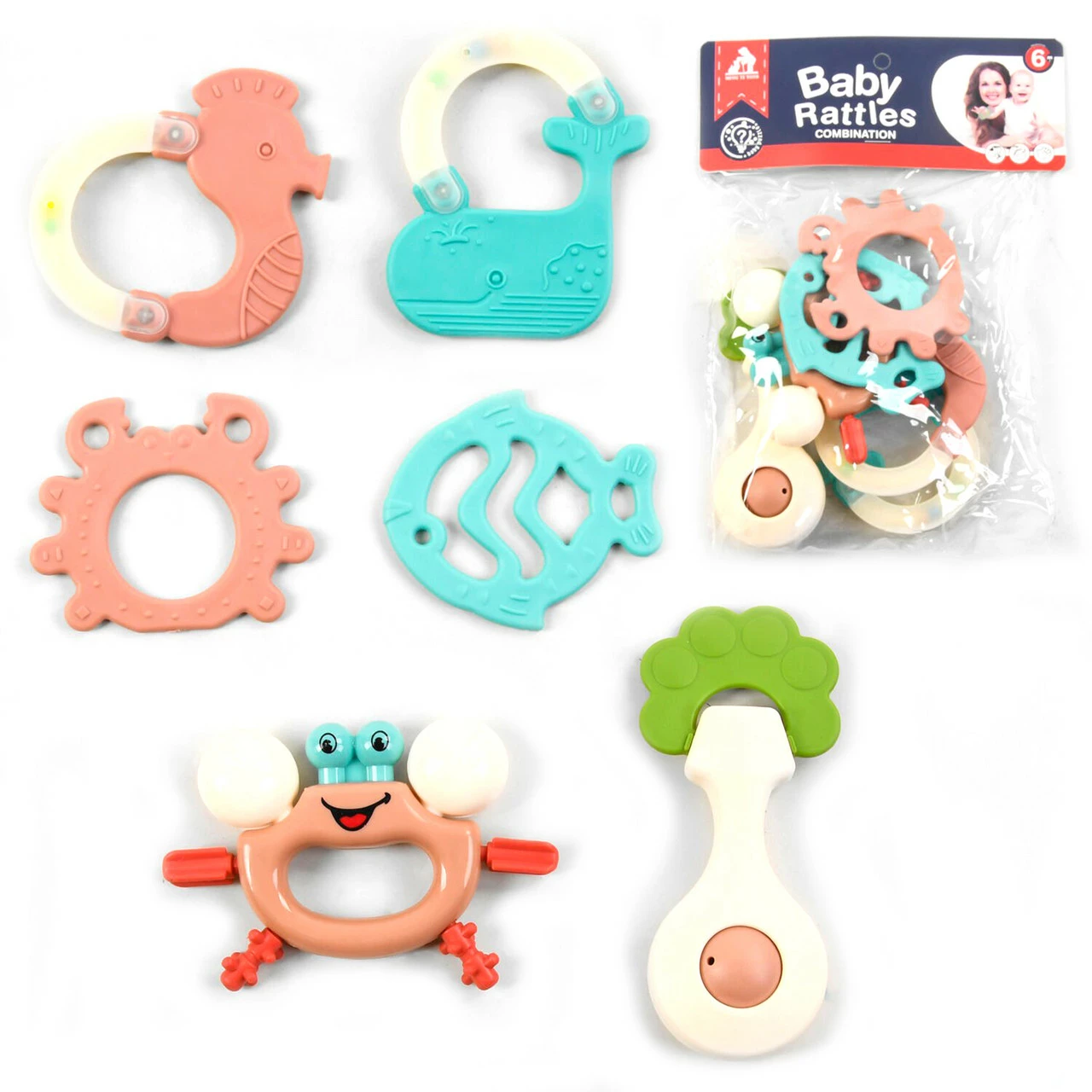 1. Погремушка - крабик обладает фактурной поверхностью и дополнена