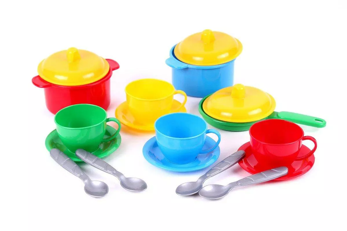 Комплект состоит из 4-х чашек, тарелок и ложек, 2-х кастрюль,