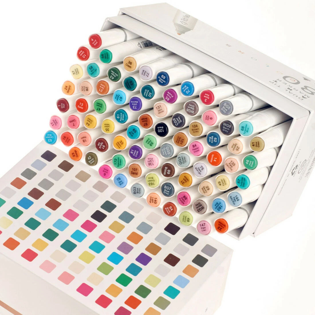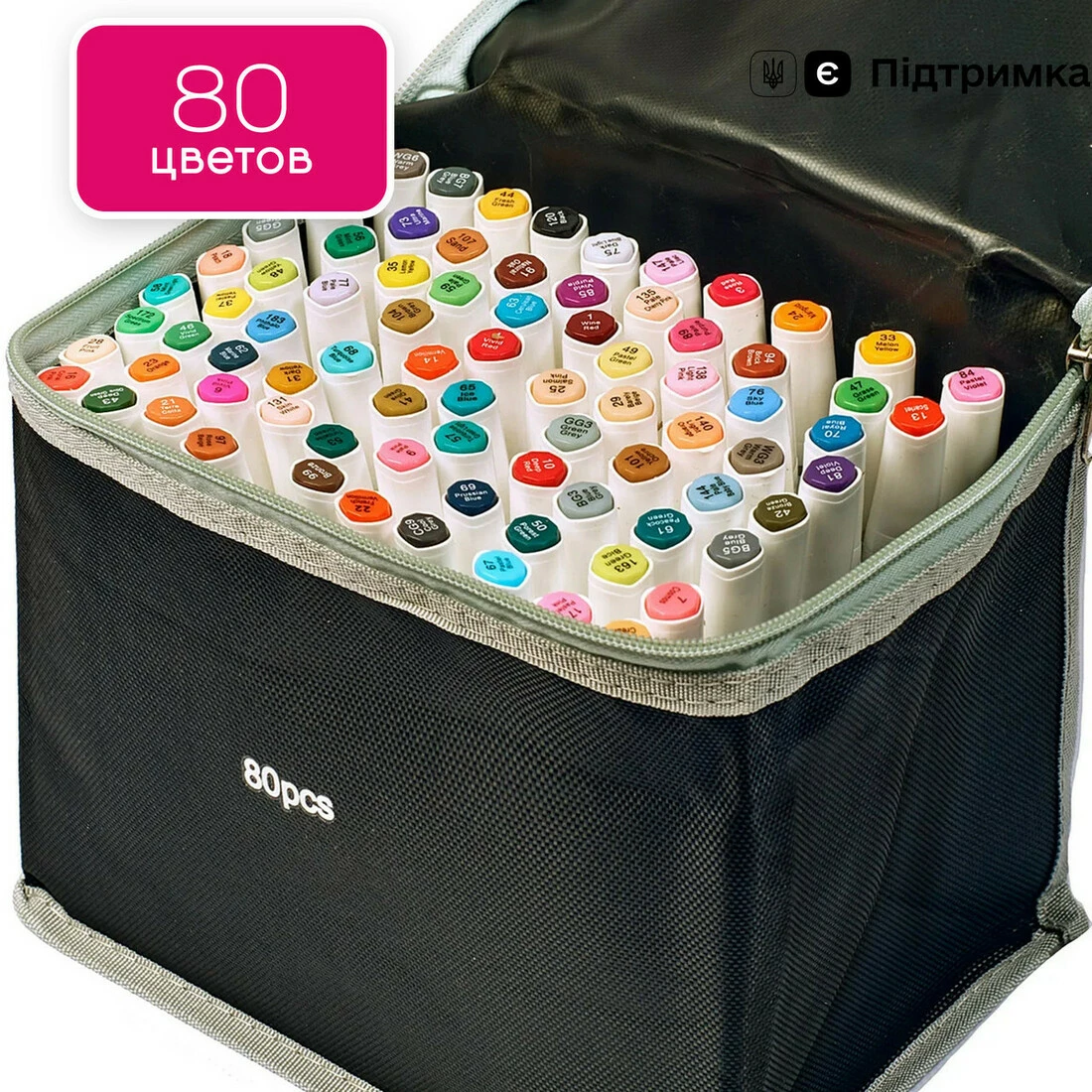 В наборе 80 маркеров разных цветов. Корпус пластиковый, гладкий.