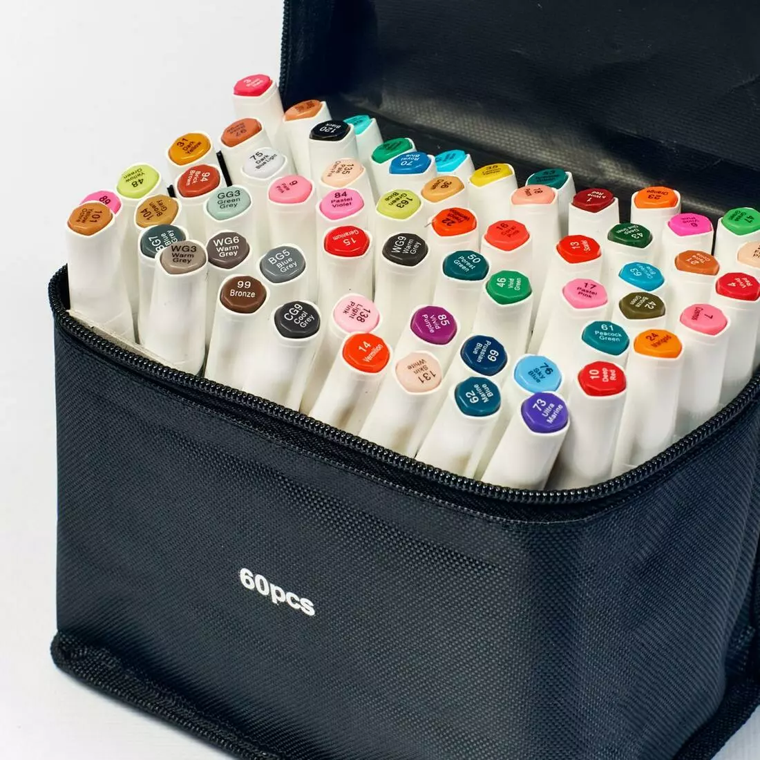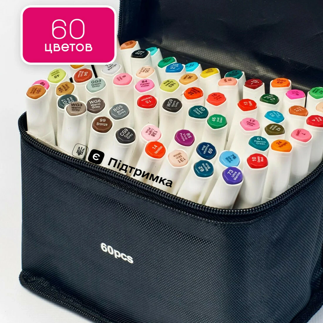 60 маркеров разных цветов. Корпус пластиковый, гладкий. Колпачки