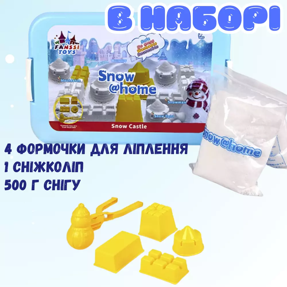 В комплект входят 500 г кинетического снега, 4 формочки для