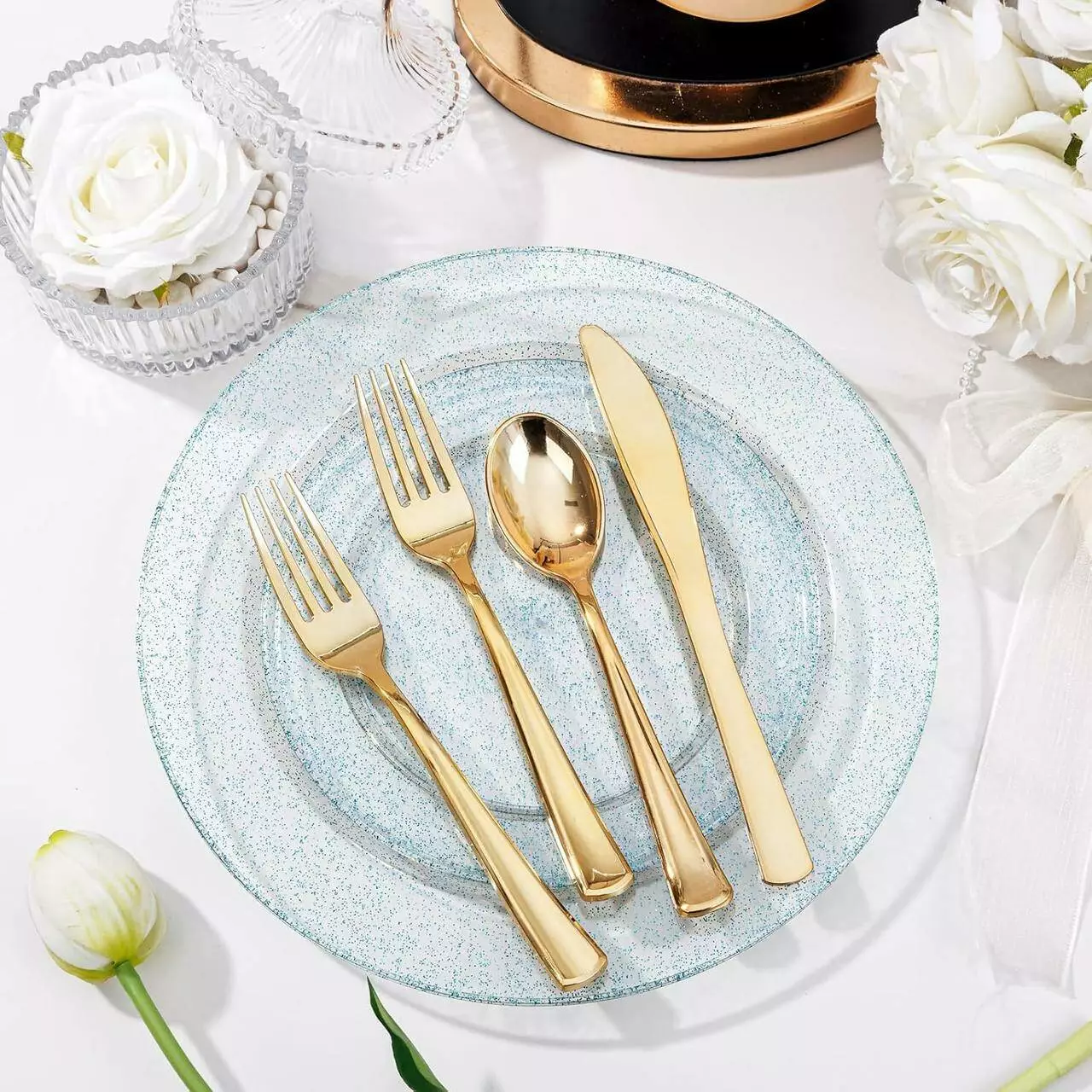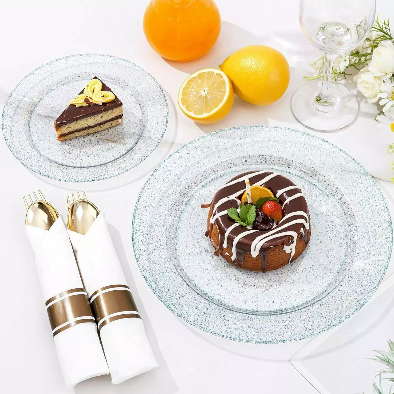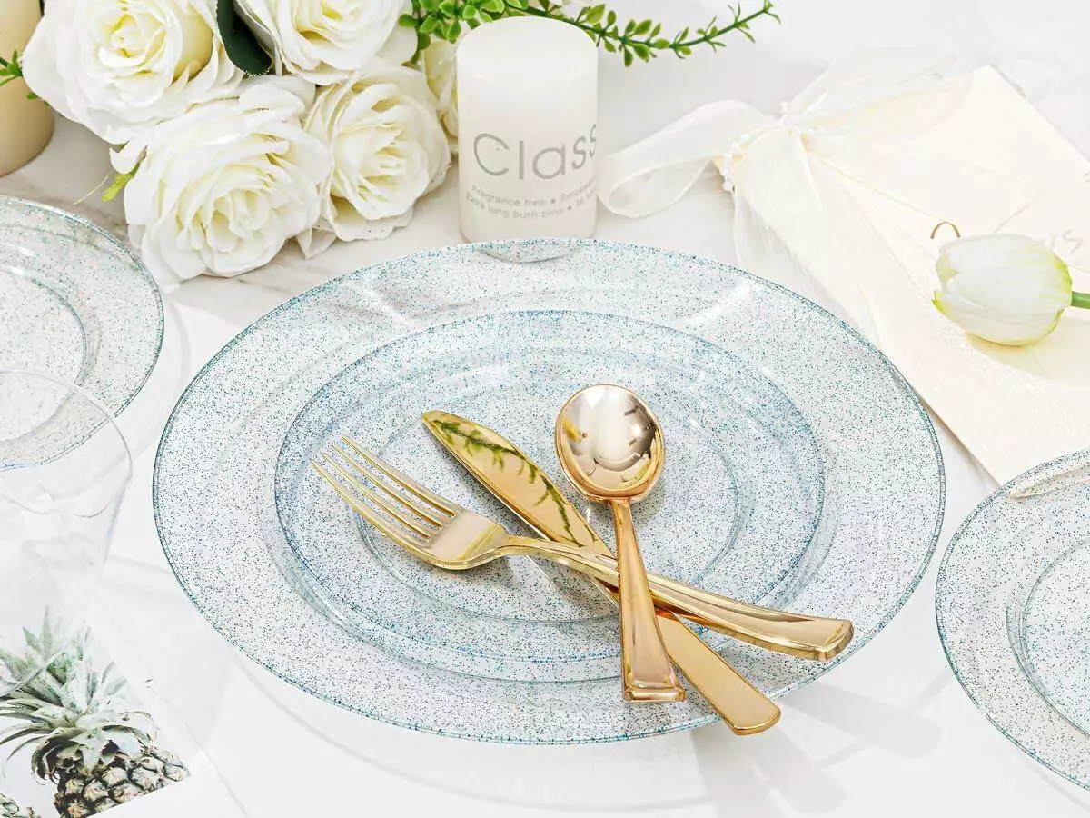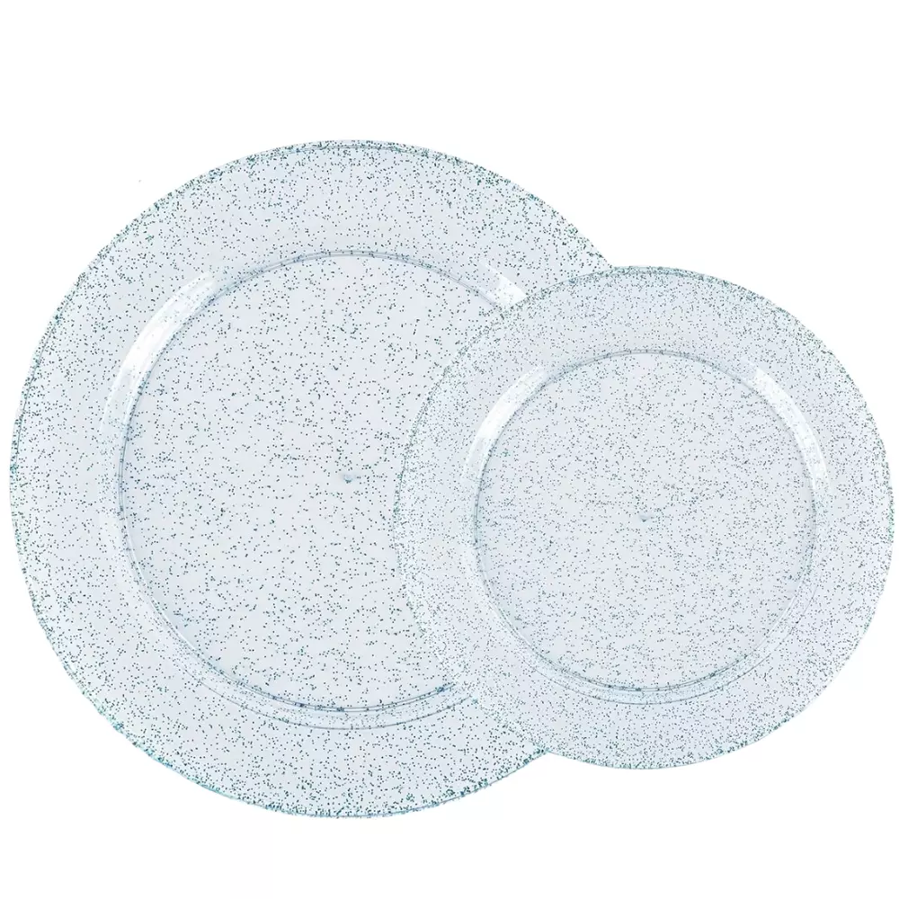 прозрачные тарелки с блёстками придают посуде изысканный и