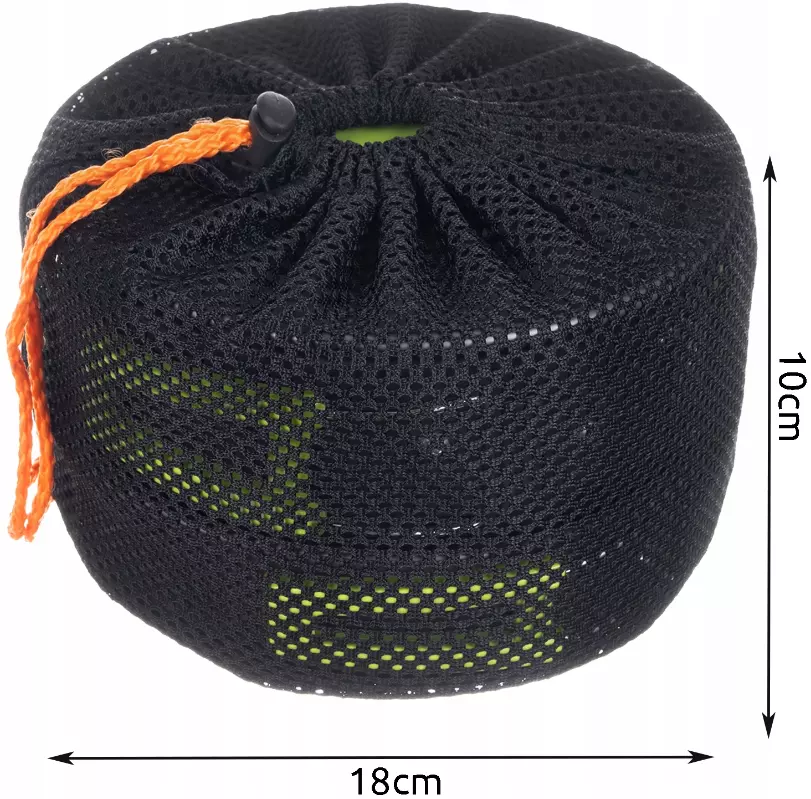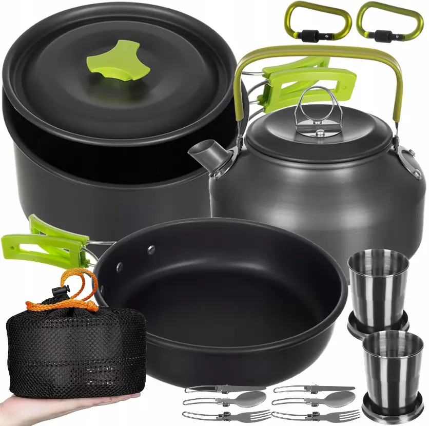 В комплект туристической посуды входит 18 элементов, включая кастрюлю, чайник, сковороду, 2 складных ножа, вилку и ложку, 2 карабина, 2 складных кружки, мешочек для хранения.