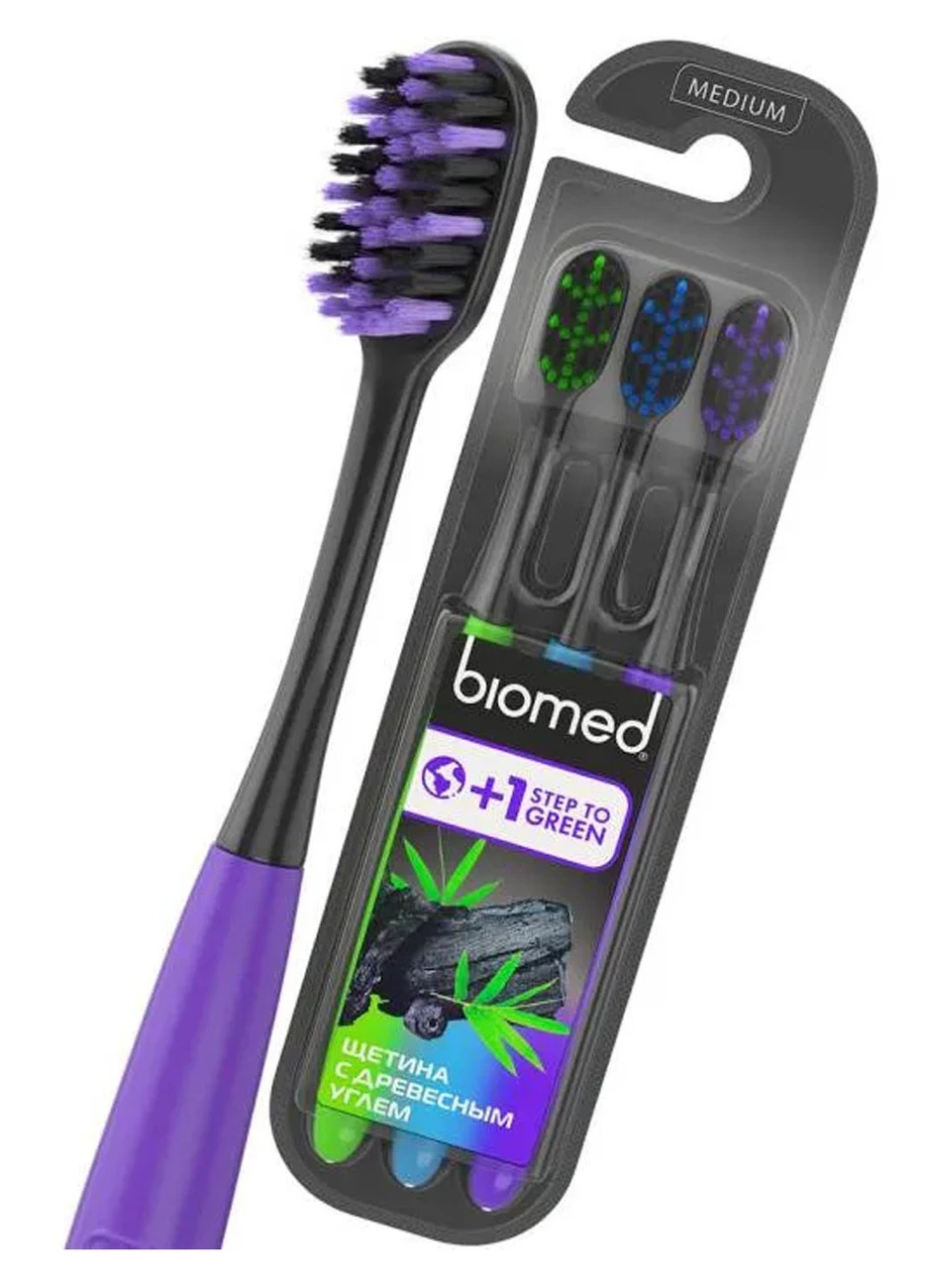 Щетина с угольным напылением способствует эффективному удалению зубного налета. Закругленные кончики щетинок делают процесс чистки зубов безопасным и не травмируют десны. Специальная форма головки обеспечивает легкий и быстрый доступ к жевательным зубам для эффективного очищения. Для наилучшего эффекта используйте совместно с комплексными натуральными зубными пастами Biomed