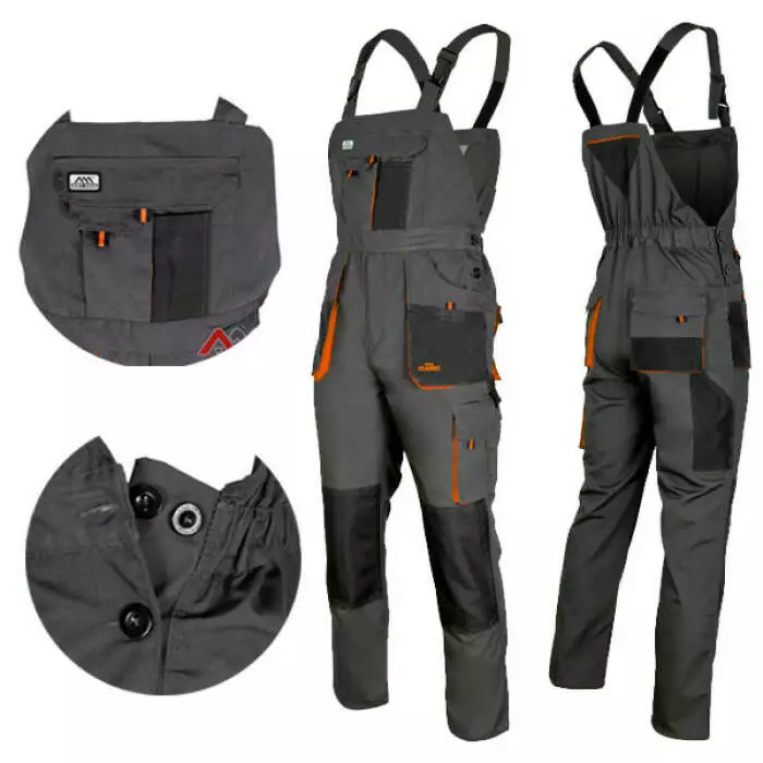 Зовнішньо робочий напівкомбінезон професійно виглядає, має графітовий з додаванням помаранчевого та чорного кольорів. Потрійні шви і численні міцні болти додатково зміцнюють місця, особливо схильні до розривів. До того ж він дуже практичний і зручний, має безліч доповнень для різних аксесуарів.