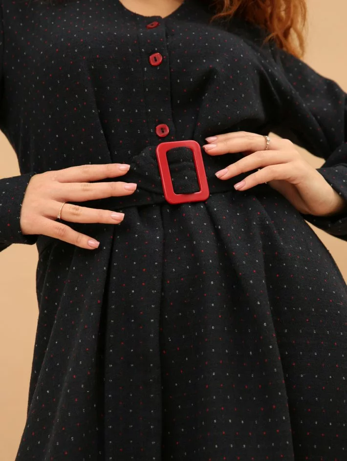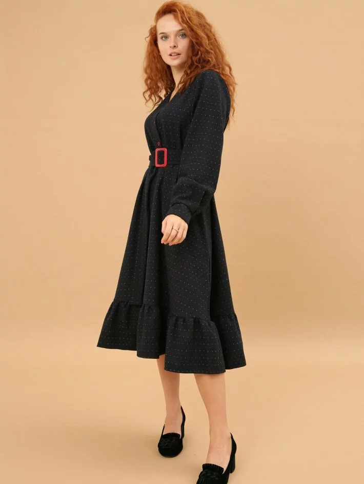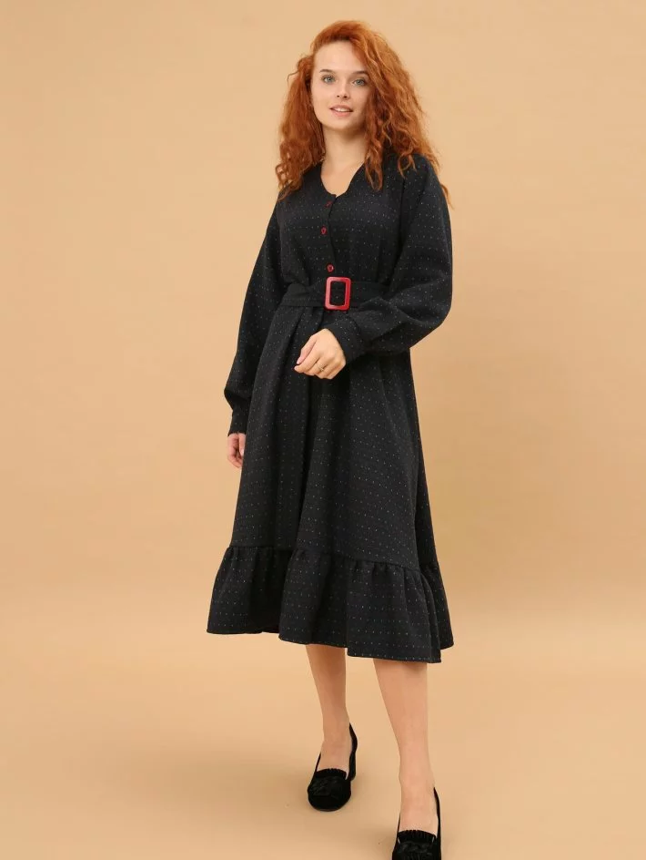 Напівприталена сукня з яскравими ґудзиками та пряжкою на поясі.