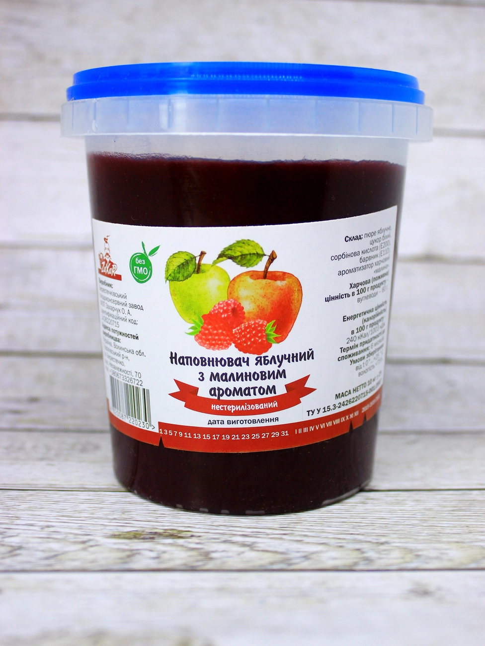 Состав: пюре яблочное, сахар, консервант Е200, краситель Е110, ароматизатор идентичный натуральному «малина». Энергетическая ценность (калорийность) - 240 ккал/100 г. Пищевая (питательная) ценность 100 г: углеводов - 60 г. Срок годности - 6 м.