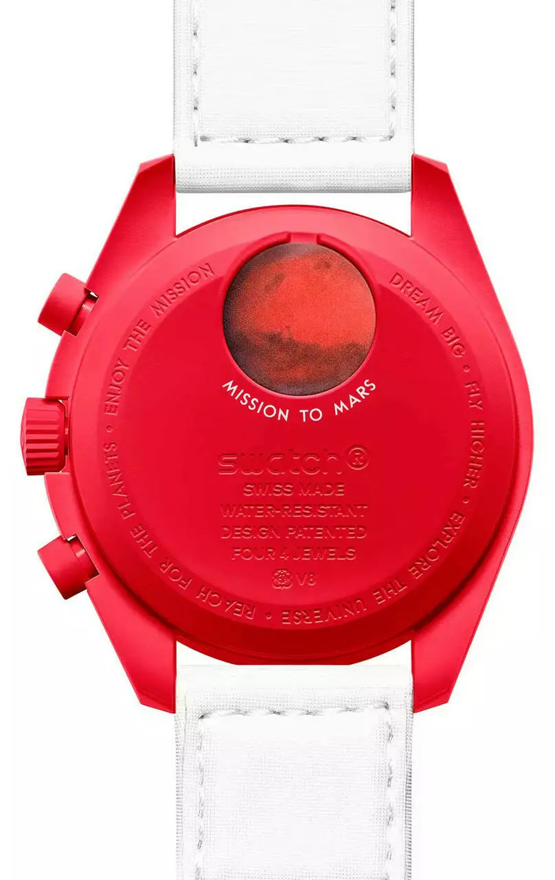 Каждая крышка отсека батареи на задней панели имеет изображение планетарного тела, которое вдохновило на дизайн именно этой модели. Также, на задней крышке каждого BIOCERAMIC MOONSWATCH напечатано текст миссии и встроенная формулировка, которая обязательно вдохновит. "Мечтайте больше - Летите высоко - Исследуйте Вселенную - Достигайте планеты".