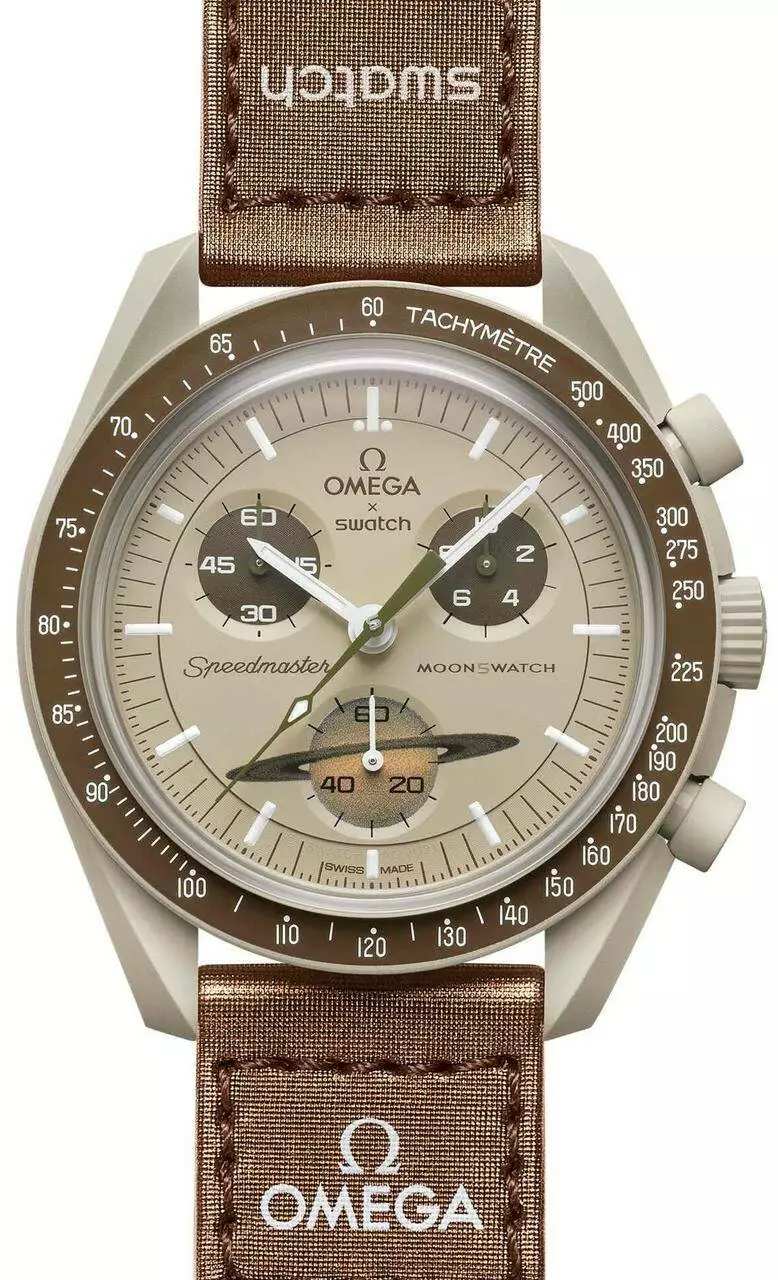 Дизайн каждой модели часов вдохновлен планетой или небесным телом в Солнечной системе. На всех циферблатах счетчики расположены так же, как в классических хронографах Swatch. Они используют тот же кварцевый калибр, что позволяет расположить стрелки таким образом. Что выводит эту коллекцию на орбиту, так это сочетание инновационного материала Swatch BIOCERAMIC с ключевыми элементами дизайна OMEGA Speedmaster Moonwatch. Водонепроницаемость в этом случае составляет 3 бара или 30 метров. Это означает, что фактическая водостойкость позволяет противостоять брызгам при мытье рук. Ремешок на липучке очень удобен и идеально подходит для ежедневного ношения.