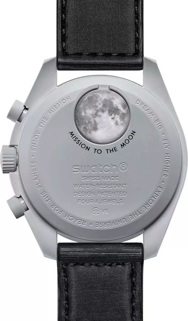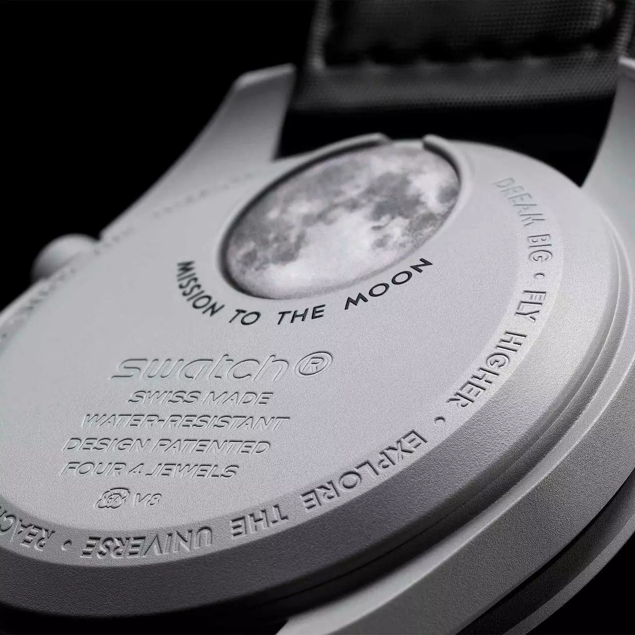 Каждая крышка отсека батареи на задней панели имеет изображение планетарного тела, которое вдохновило на дизайн именно этой модели. Также, на задней крышке каждого BIOCERAMIC MOONSWATCH напечатано текст миссии и встроенная формулировка, которая обязательно вдохновит. "Мечтайте больше - Летите высоко - Исследуйте Вселенную - Достигайте планеты".