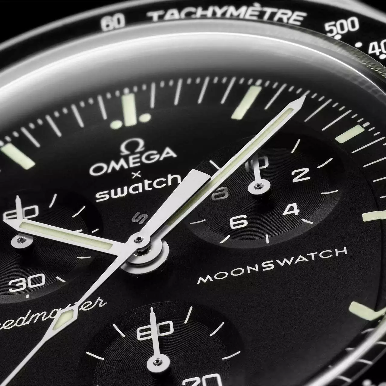 Все циферблаты имеют логотип OMEGA X SWATCH, а также культовый логотип Speedmaster и новый логотип MoonSwatch. Стеклянная конструкция, "скрытая" буква S, встроенная в центр стекла, тонкий и сложный круговой узор на внешнем кольце циферблата и дополнительных циферблатах, культовая деталь с точкой над числом "90" на тахиметре и, конечно же, уникальная биокерамическая отделка моделей и символизируют страстную любовь к деталям. Все часовые, минутные, секундные стрелки хронографа и часовые метки покрыты суперлюминесцентным покрытием для идеального свечения в темноте.