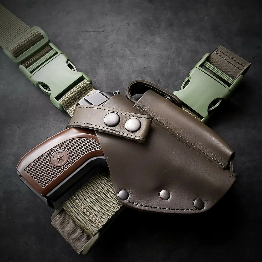 Шкіряна стегна кобура під ПМ. Виконана із натуральної щільної шкіри. Колір темна олива.