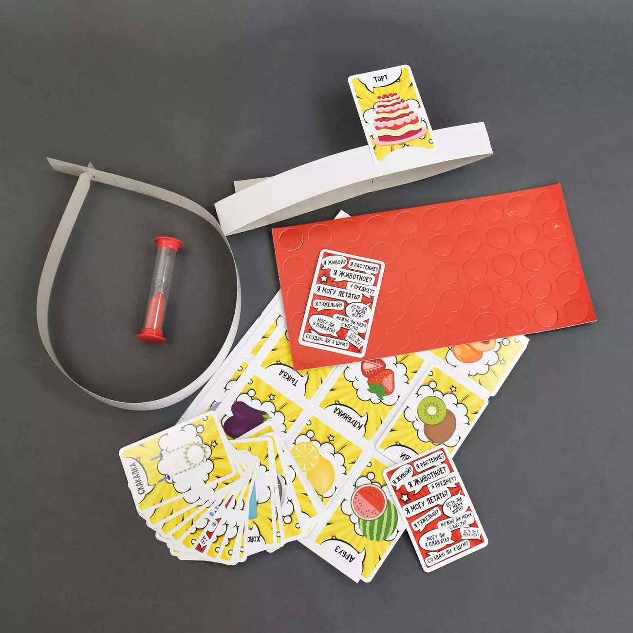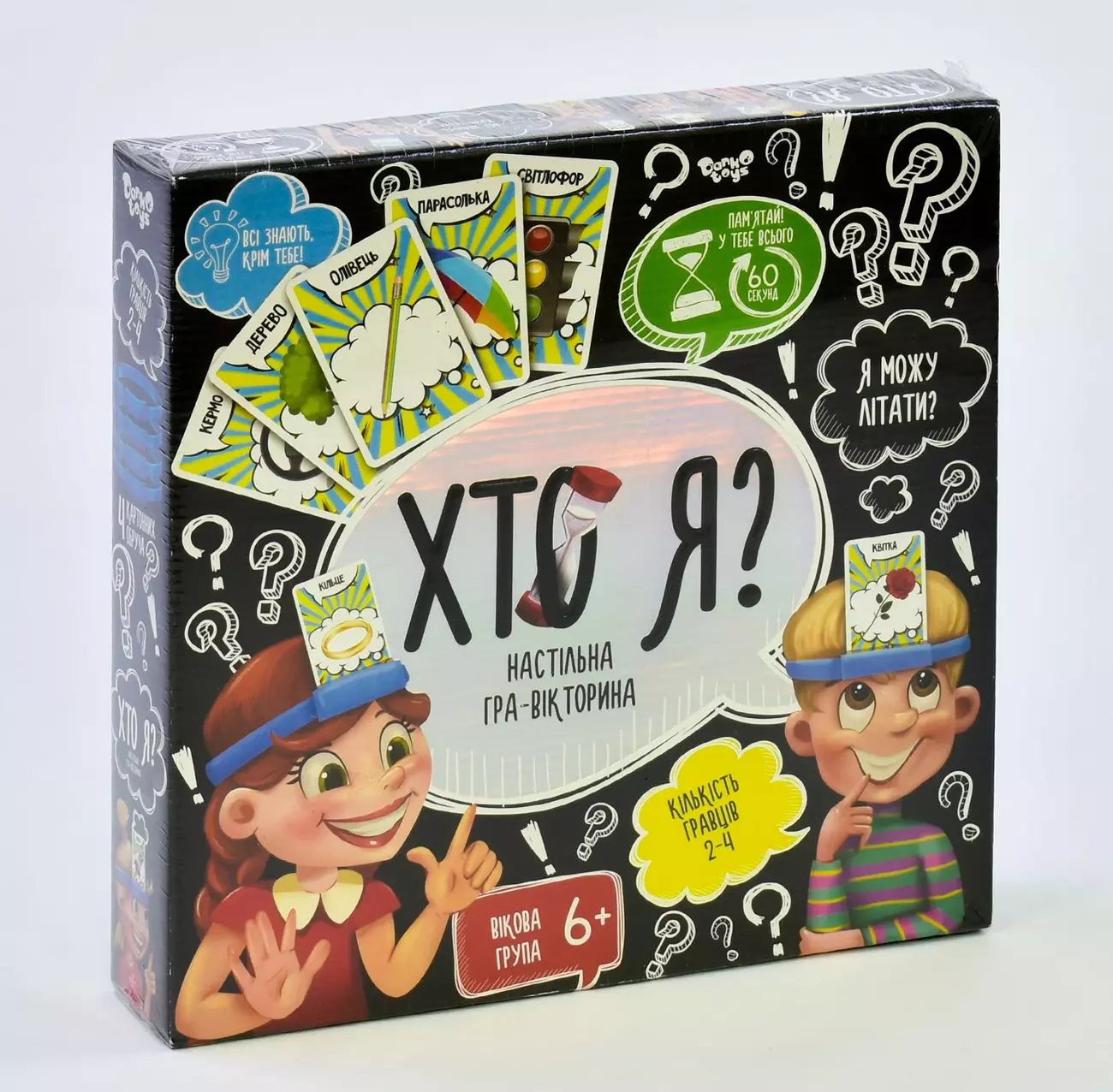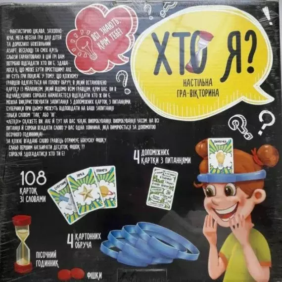 Настільна гра «Хто Я» складається з карток із зображенням різних предметів. Головне завдання полягає в тому, щоб вгадати хтось ти, не бачив зображення на своїй карті і задаючи навідні запитання іншим учасникам. Комплект містить: - ігрові картки – 112 шт.; - фішки – 100 шт.; - пісочні часи - 1 шт.; - обруч з картону – 4 шт.; - інструкція – 1 шт.