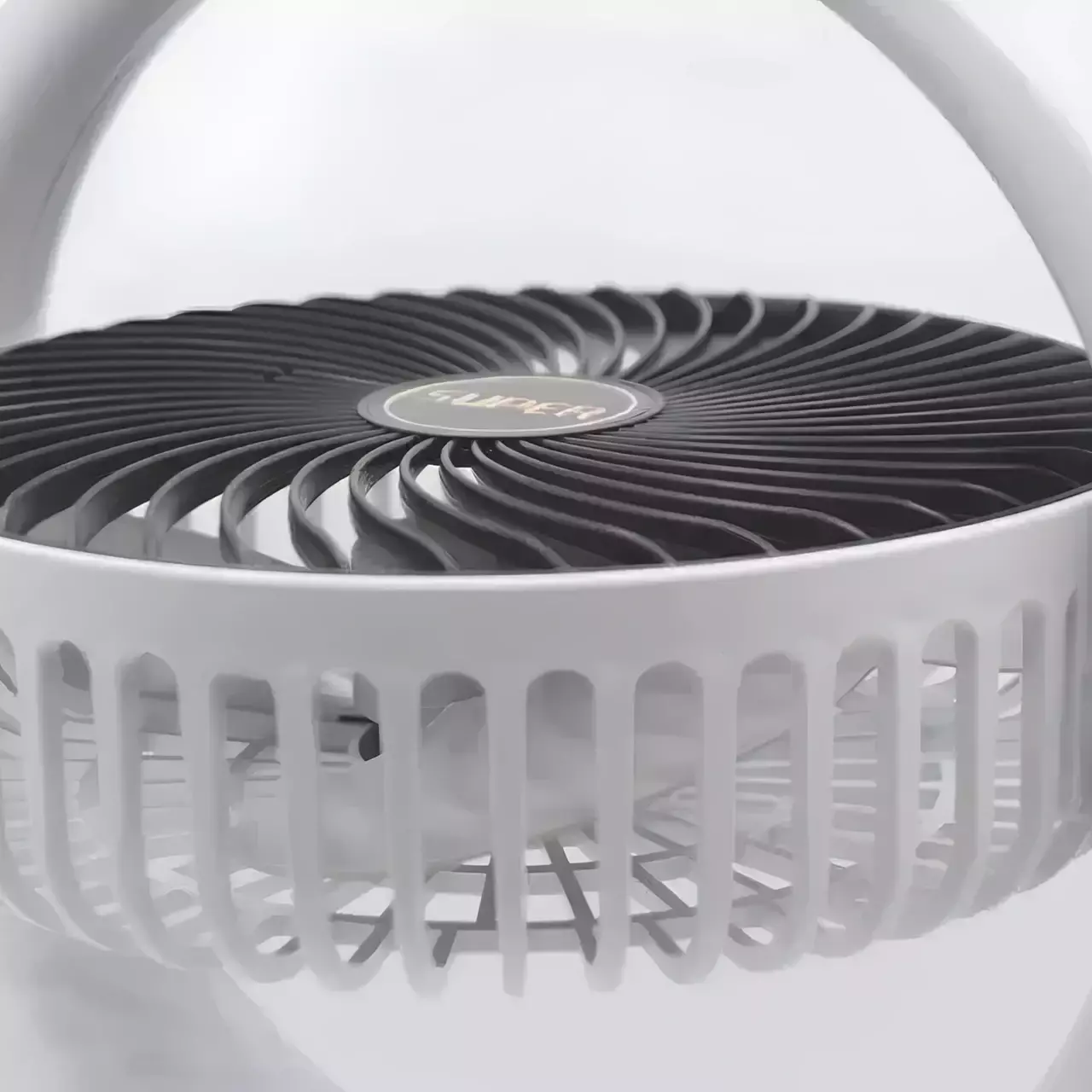Компактный дизайн и белый цвет корпуса позволяют вентилятору гармонично вписаться в любой интерьер. Вентилятор работает от аккумулятора, который заряжается через USB, обеспечивая от 2 до 5 часов автономной работы. В комплекте поставляется мини-вентилятор и USB-кабель для зарядки.