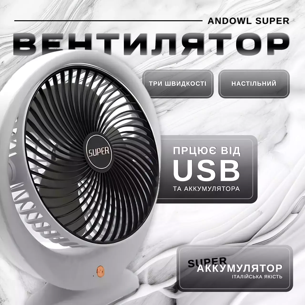 Настольный usb мини вентилятор аккумуляторный портативный Andowl Super тихий экономный охлаждение (Италия)