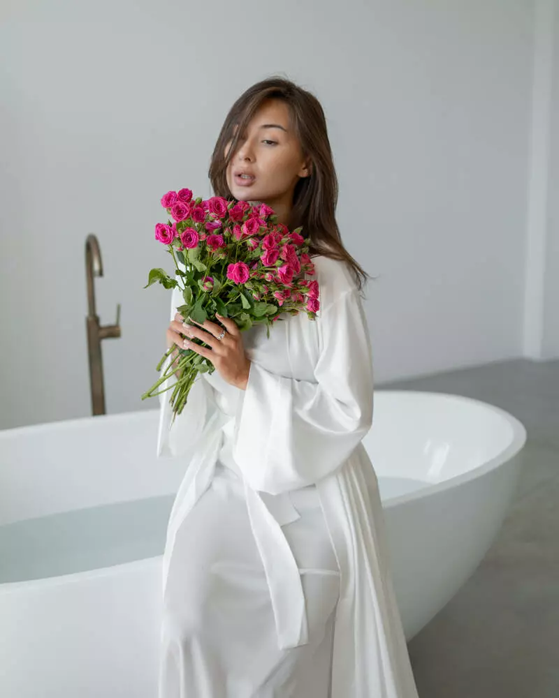 Нічна сорочка виконана з шовкової тканини Armani. Модель представлена в довжині міді з відкритою спиною, бретелі регулюються. Нічна сорочка чудово підкреслює жіночу фігуру і може поєднуватися з халатом.