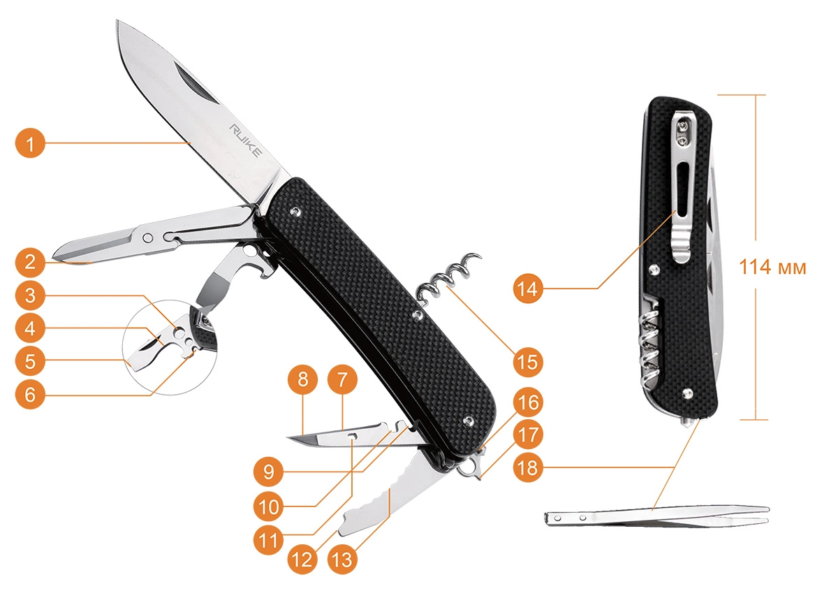 - у складеному вигляді довжина ножа дорівнює 114 мм, а у