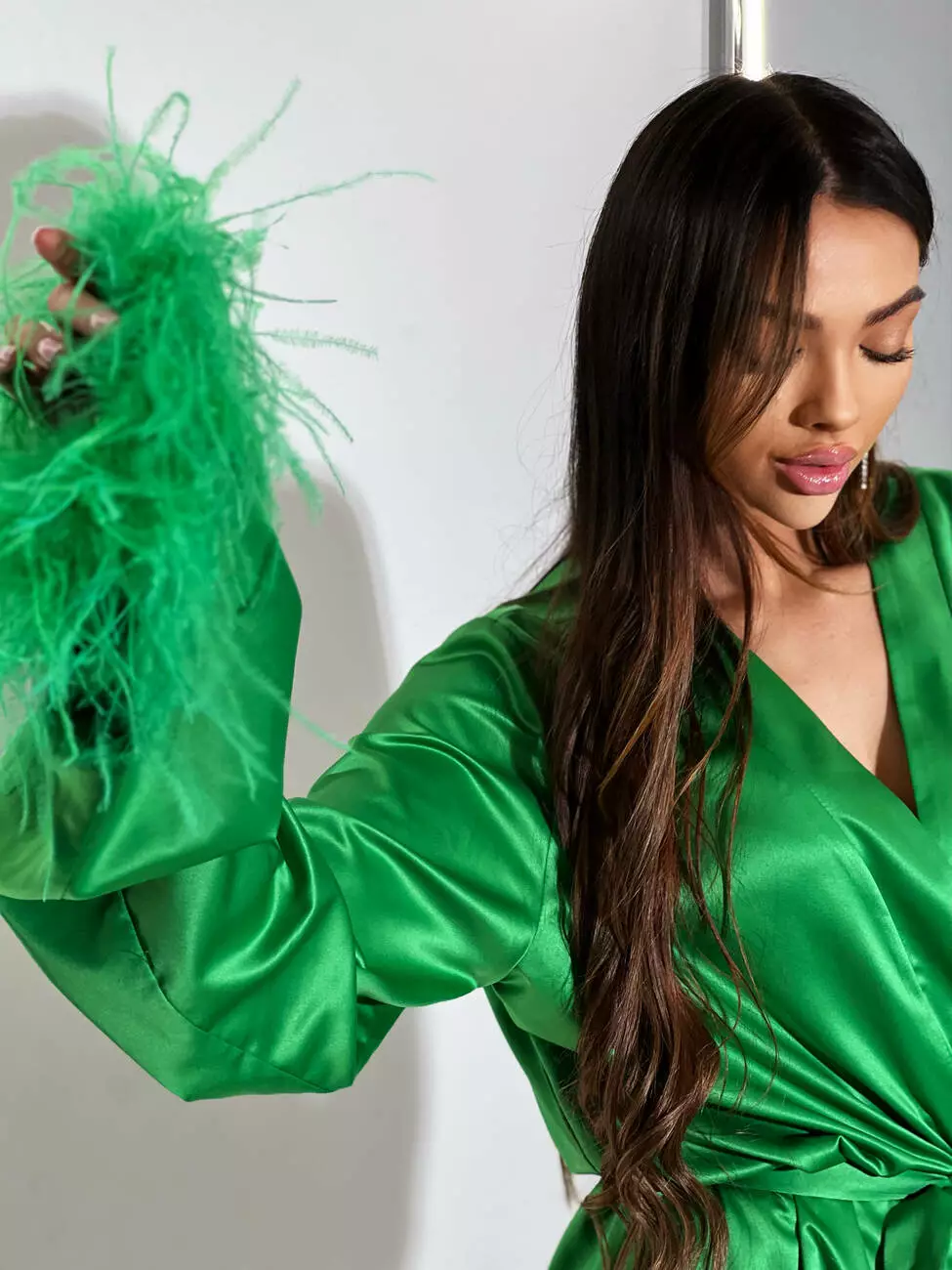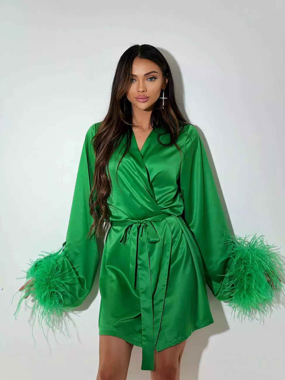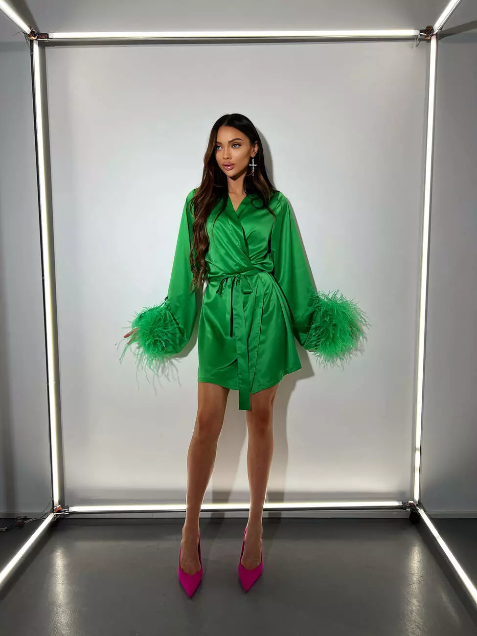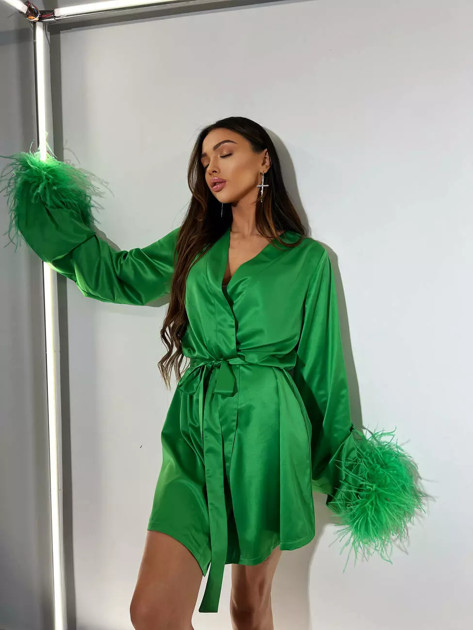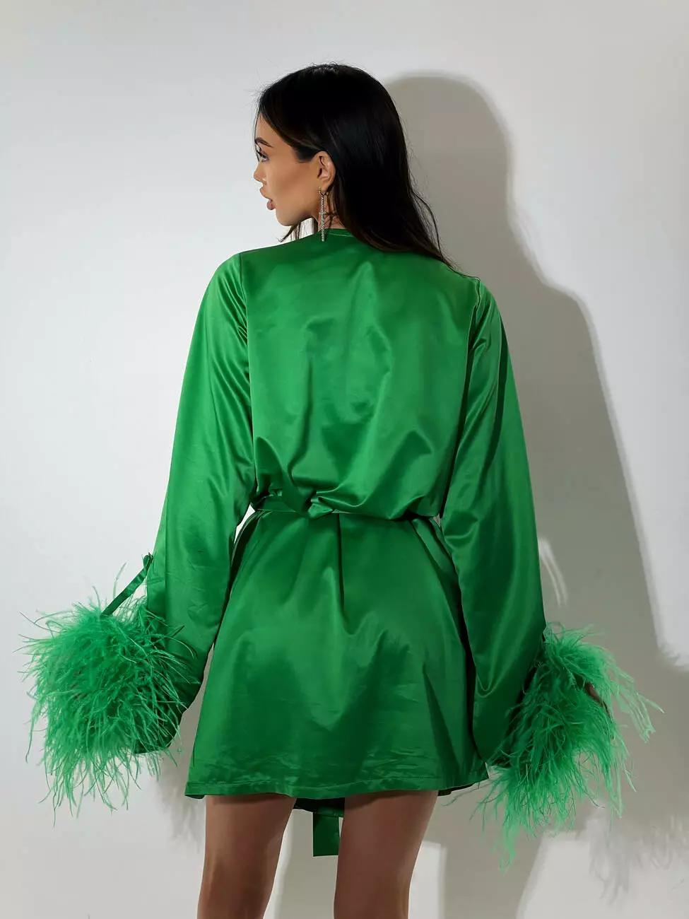 Ніжна сатинова сукня БОА з декорованими пір'ями зеленого кольору