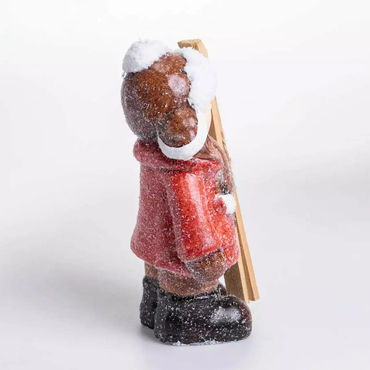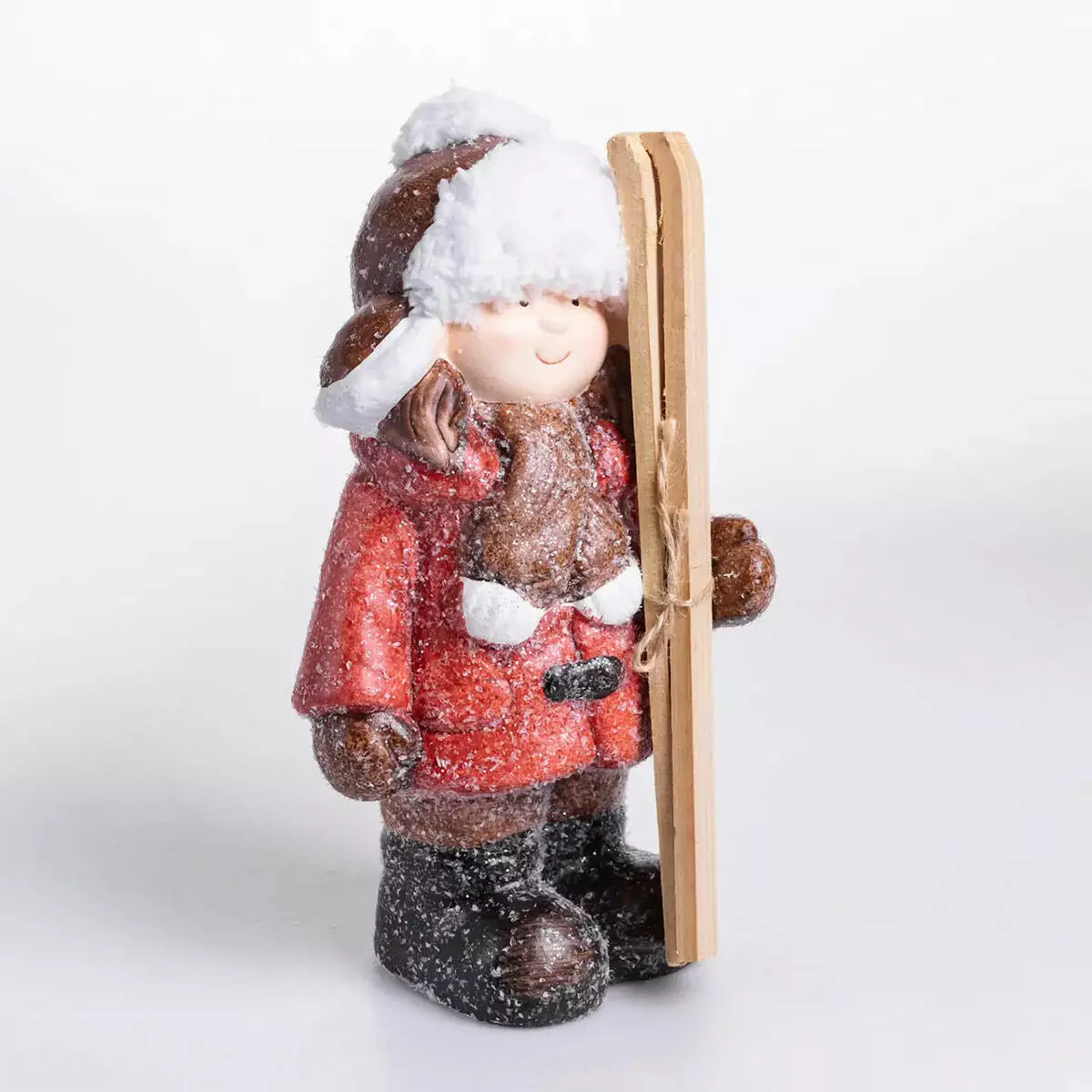 Порцелянова фігурка "Дівчинка з лижами" зображує дитину в зимовому вбранні, що тримає лижі. Вона одягнена в червоне пальто з фактурною поверхнею, коричневі штани, чорні чоботи, бежевий шарф і білу шапку. Усміхнене обличчя з рум’яними щічками створює теплий, святковий настрій.